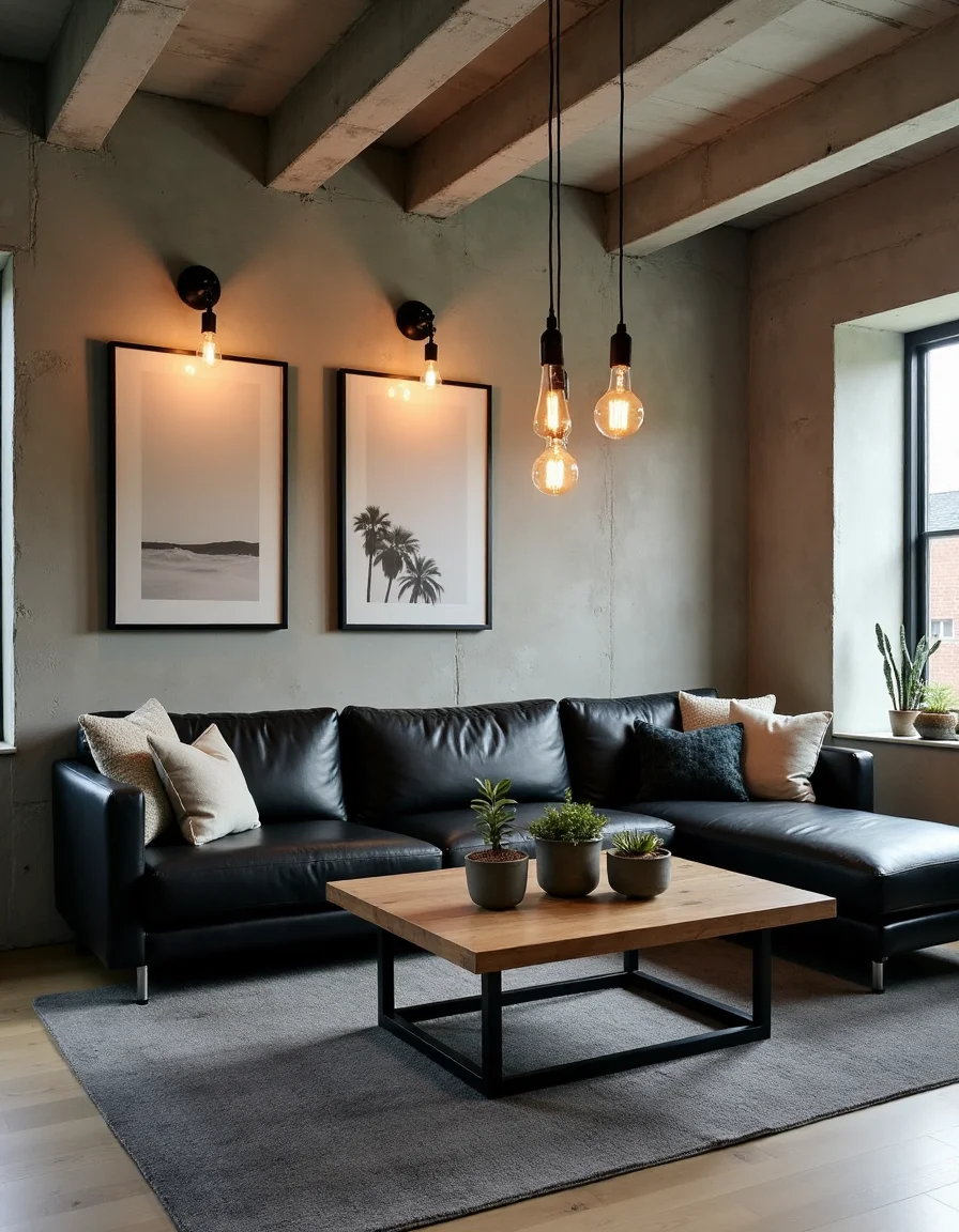The living room exudes an industrial charm with its exposed concrete walls and ceiling beams that speak to raw sophistication. Anchored by a large black leather sectional sofa, the space invites comfort while the deep gray area rug beneath adds warmth and texture. A reclaimed wood coffee table sits at the center, showcasing steel legs that complement the metallic accents throughout the room, while on it, a few minimalist concrete planters house small succulents, blending nature with urban style. Industrial-style lighting fixtures, including a trio of vintage Edison bulb pendant lights hang from the ceiling, casting a warm glow across the room and highlighting the minimalist black-framed artwork on the walls.