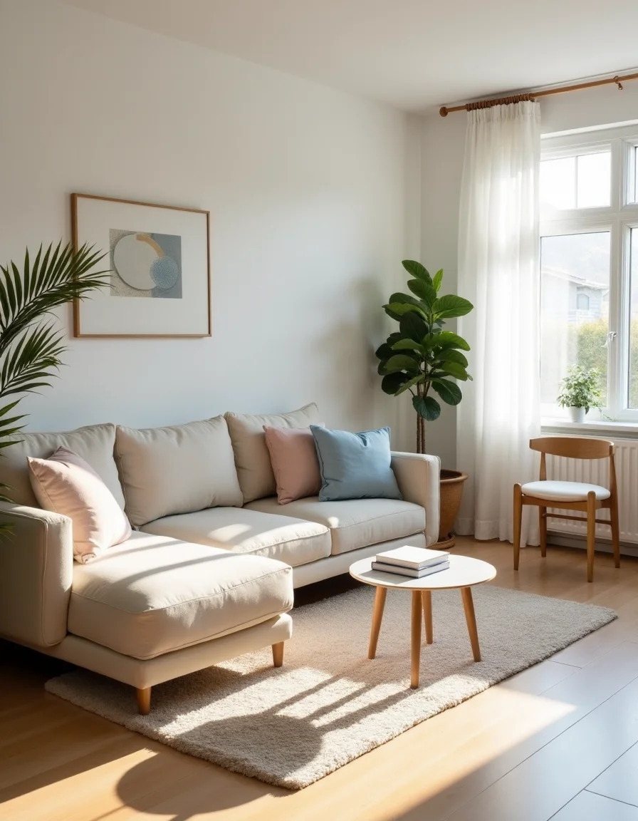 The living room boasts a serene Scandinavian ambiance, characterized by a harmonious blend of soft colors and pale tones. A light oak wooden floor complements the crisp white walls, while an oversized beige linen sofa, adorned with pastel blue and blush pink throw pillows, anchors the space. A plush area rug in a subtle geometric pattern lies beneath the coffee table, which features clean lines and a light wood finish. Wispy sheer curtains drape from the window, allowing natural light to cascade in softly, illuminating the room's fresh green potted plants strategically placed in the corners. A minimalist wooden bookshelf filled with curated decor pieces and books on one side, along with a small round table with a pale marble top and simple Scandinavian dining chairs, adds functionality without cluttering the openness of the room.
