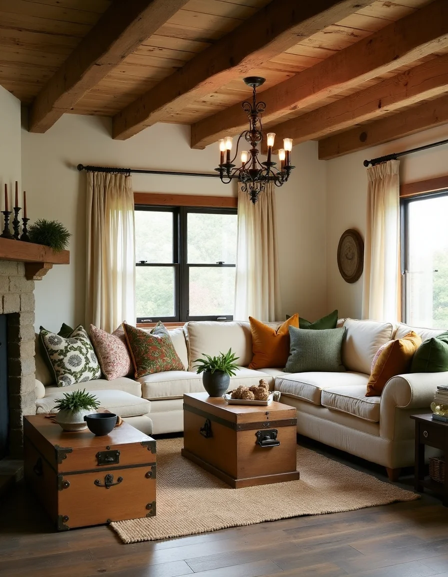 The living room exudes a warm rustic charm, characterized by rough-hewn wooden beams framing the ceiling and distressed hardwood floors that echo a bygone era. A large, oversized beige sectional sofa with soft, layered textiles in neutral earth tones is adorned with an array of patterned throw pillows in deep greens, ochres, and muted florals, complementing a reclaimed wood coffee table at the center. Surrounding the space are vintage wooden trunks serving as side tables, a handmade woven rug underfoot adding texture, and a trio of handcrafted ceramic candlesticks on the mantelpiece made from found materials. Warm light filters through sheer linen curtains, accentuating the rustic charm with an antique chandelier illuminating the special corners of the room, while a collection of potted succulents on the windowsill brings in nature's vibrant greenery.