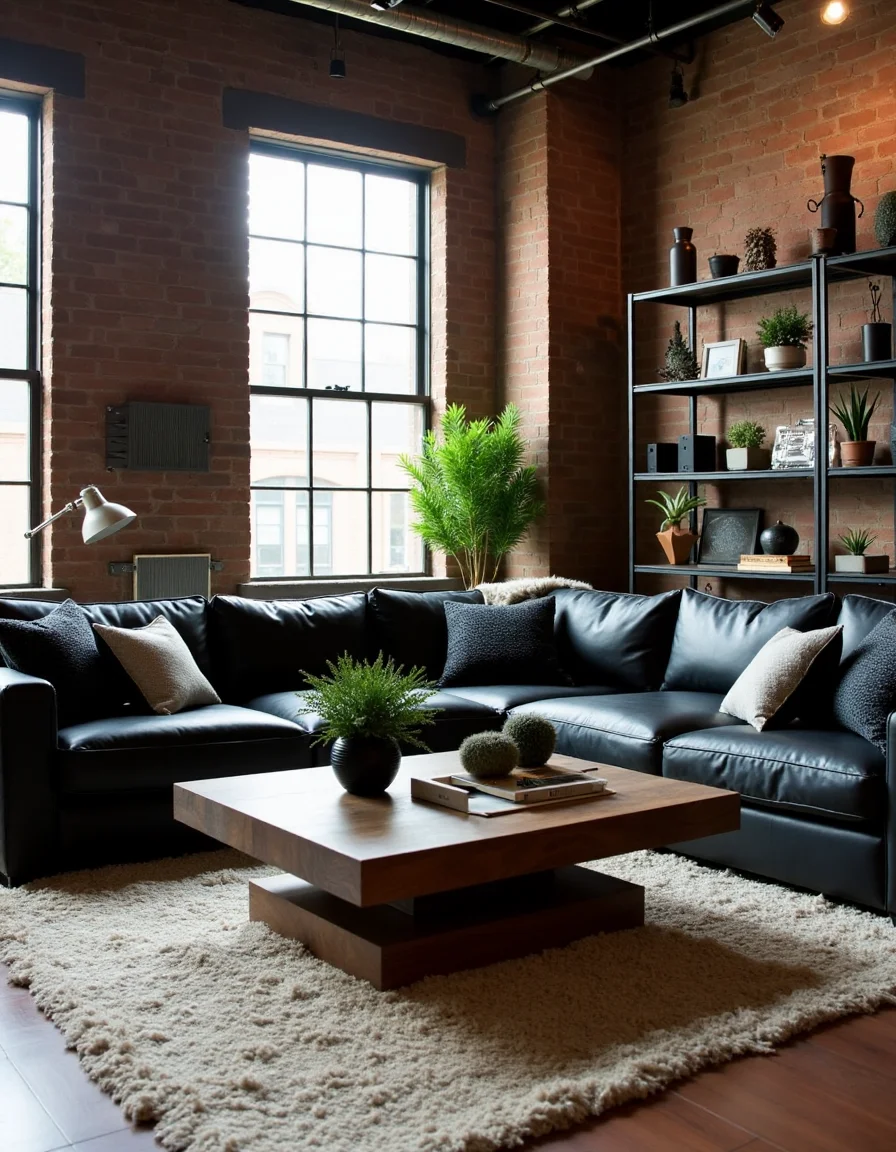 The living room embraces an industrial aesthetic, featuring a stunning combination of deep gray and black tones throughout. Ceiling-to-floor windows flood the space with natural light, illuminating the exposed brick walls and highlighting the rough-hewn steel beams overhead. A solid wooden coffee table, finished in a rich walnut color, sits at the center of a large, inviting black leather sectional sofa adorned with textured charcoal and slate gray throw pillows. Surrounding the room, vintage metal shelves showcase eclectic decor items such as industrial-style lamps, a mix of potted succulents, and abstract metal art pieces, creating a stylish yet relaxed ambiance that perfectly balances warmth and modernity.