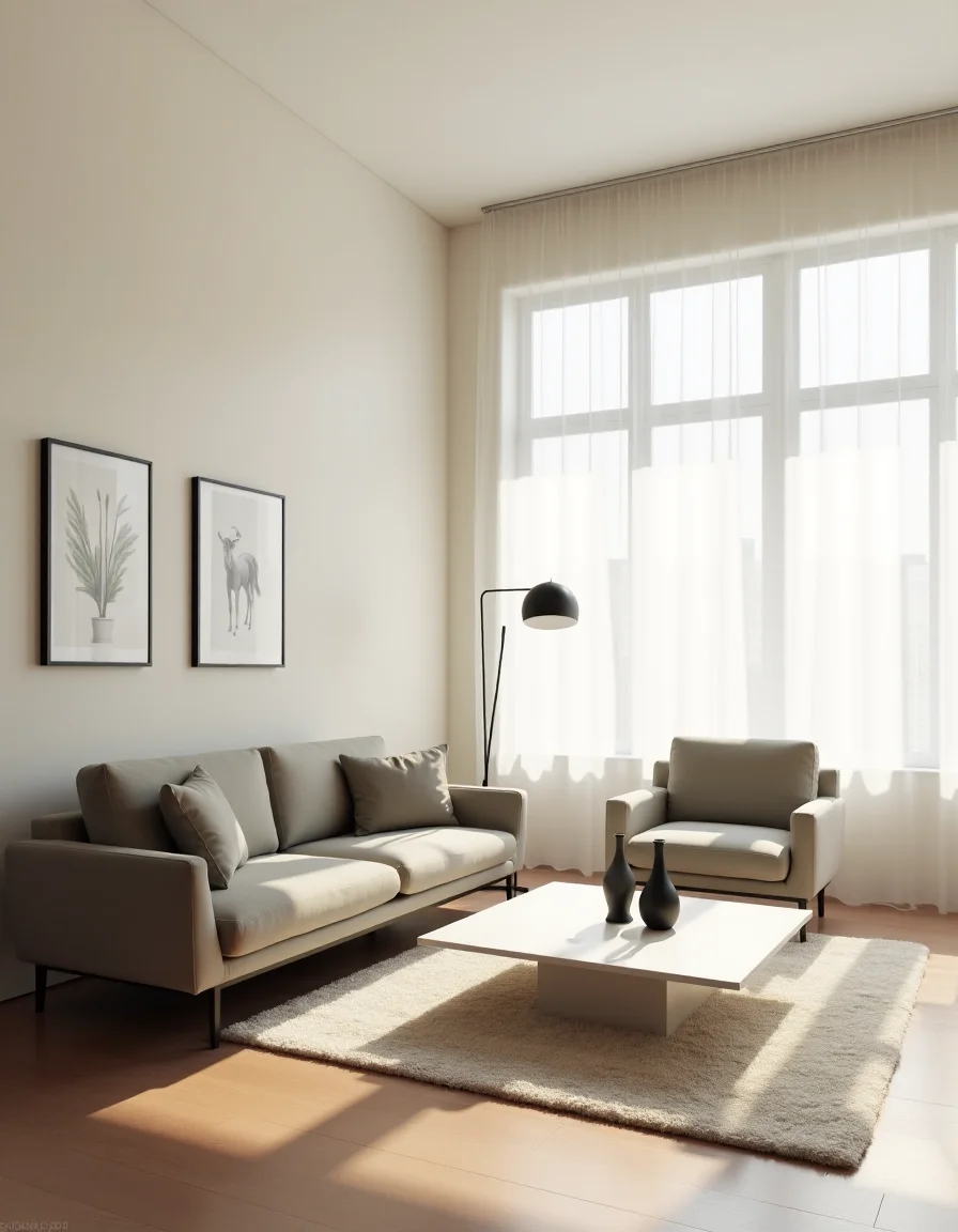This minimalist living room embodies an elegant simplicity and a tranquil atmosphere. The walls are painted a soft cream color, enhancing the sense of space, with a large window draped in sheer white curtains allowing natural light to filter gently in. A streamlined, low-profile sectional sofa in a muted grey fabric anchors the room, adorned only with a couple of monochromatic throw pillows. Across the room, a sleek white coffee table floats above a plush light beige area rug, complemented by a single modern armchair in a matching tone, creating an inviting yet minimalistic seating arrangement. A slender, floor-mounted lamp with a matte black finish stands beside the chair, while subtle art pieces in monochrome frames hang delicately on the walls, contributing to the quiet aesthetic of the space.