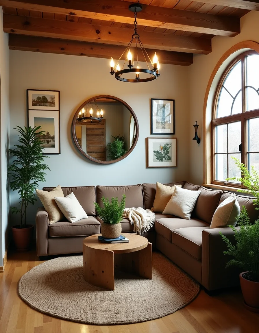 The living room emanates a cozy, rustic charm, illuminated by warm, golden lighting from a wrought-iron chandelier hanging gracefully from a wooden beam ceiling. A deep walnut-toned sectional sofa, adorned with plush, beige cushions and textured, knitted throws, is positioned in a U-shape, inviting conversation around a reclaimed wood coffee table, showing off its unique grain and character. On the walls, you’ll find a mix of framed vintage landscape art and botanical prints, complemented by a large wall-mounted rustic mirror that reflects natural sunlight from a nearby half-circle window. To add warmth to the floor, an oversized, handwoven jute rug grounds the space, while strategically placed potted plants in earthy clay pots breathe life into the room, combining a mix of lush ferns and trailing ivy.