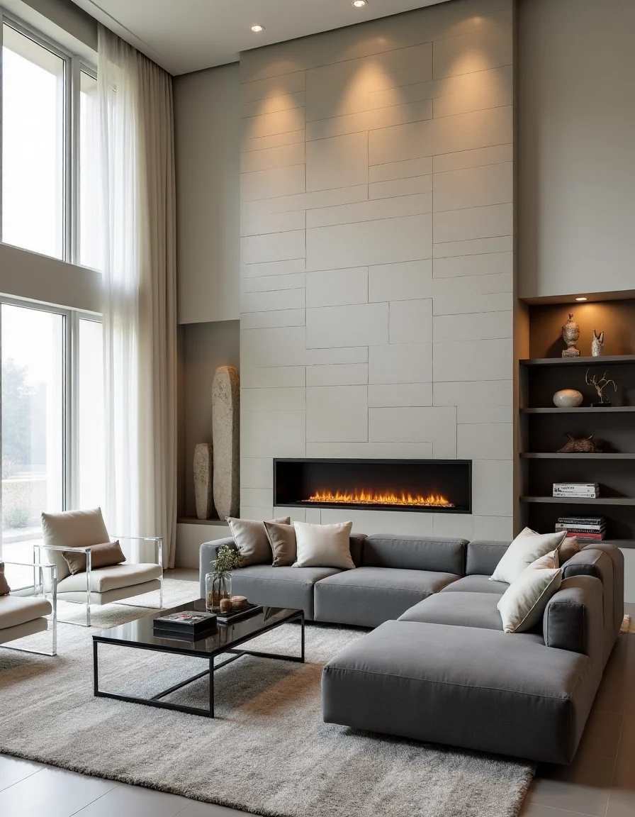 The living room embodies a modern aesthetic with minimalist elegance, featuring a sleek rectangular glass coffee table positioned centrally on a soft gray area rug. A large sectional sofa in a muted charcoal fabric is adorned with an assortment of throw pillows in subtle tones of white and beige, providing comfort while maintaining simplicity. A striking floor-to-ceiling stone accent wall serves as a backdrop, with a contemporary electric fireplace seamlessly embedded, casting a warm glow throughout the space. To enhance the airy feel, two clear acrylic armchairs flank one side of the coffee table, and a tall, vertical metal bookshelf filled with select art books and decorative sculptures adds a stylish touch to the opposite wall. Large windows with sheer white curtains allow ample natural light to flood in, creating a bright, inviting atmosphere that seamlessly blends the indoor and outdoor environment.