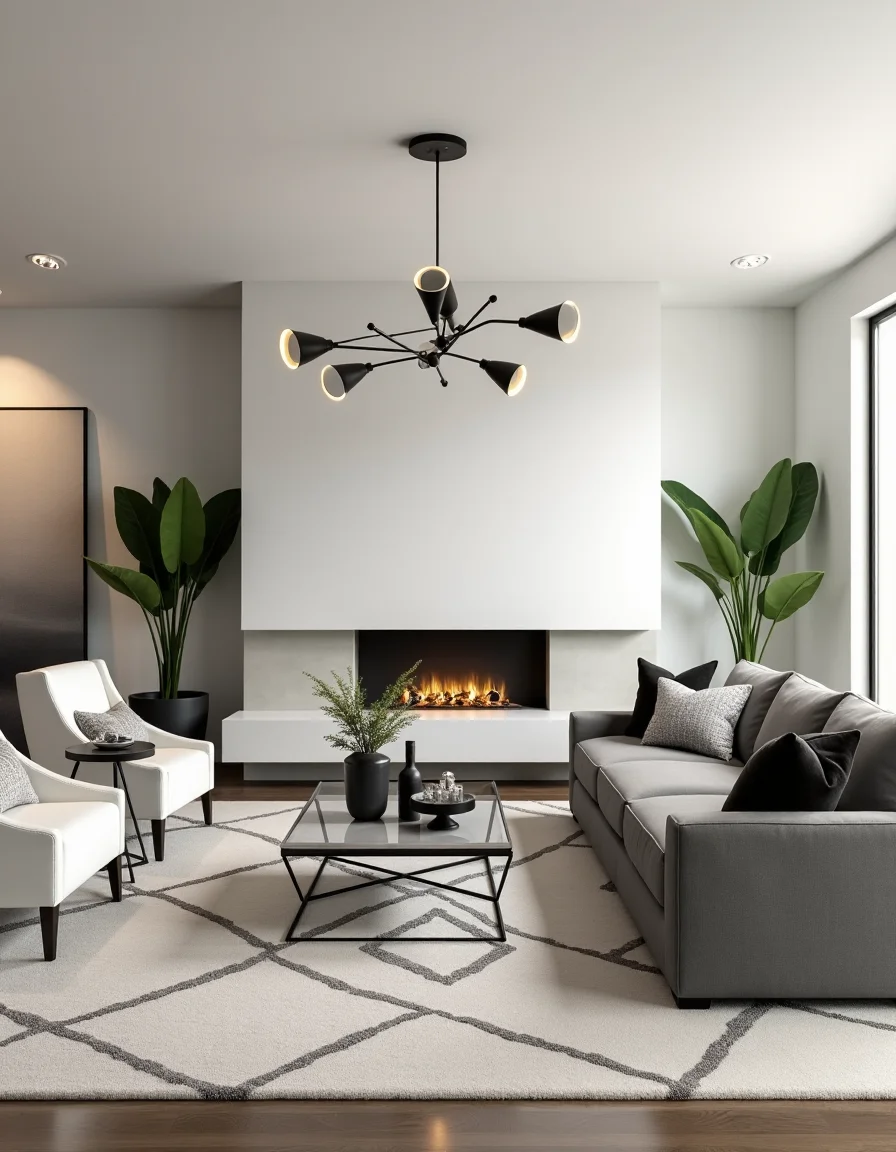 The living room boasts a modern aesthetic, highlighted by a minimalist color palette of soft whites and greys paired with natural stone accents. A sleek, charcoal grey sectional sofa is positioned in a U-shape around a central, low-set glass coffee table with a geometric metal base. To enhance the clean lines of the space, a pair of white armchairs with subtle curved backs are placed opposite the sofa, framing a frosted stone fireplace that extends to the ceiling. Soft lighting is provided by recessed fixtures and a striking modern pendant light with an abstract design, which hangs above the coffee table. Finished off with bespoke decor items like a simple, large abstract wall art piece in muted tones, a contemporary area rug with intricate patterns, and strategically placed potted green plants, the room exudes a serene and sophisticated feel.