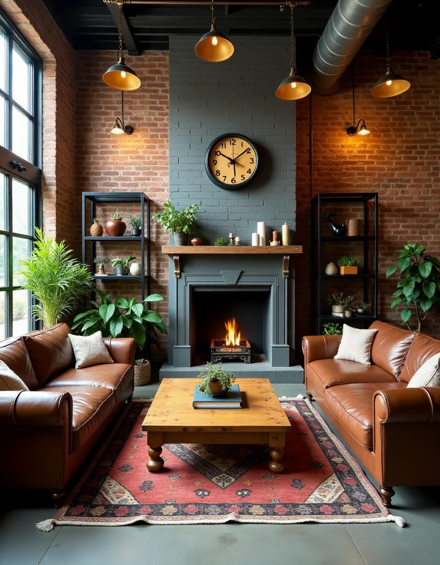 The living room is a harmonious blend of industrial aesthetics and inviting warmth. Exposed brick walls serve as a backdrop, accentuated by large ceiling windows that flood the space with natural light. In the center, a robust solid wooden coffee table with a distressed finish anchors the room, surrounded by distressed leather sofas in deep brown hues that exude comfort. A pair of black metal shelves display an assortment of plants and eclectic decorations, while a vintage area rug with geometric patterns brings a cozy touch to the polished concrete floor. Industrial-style pendant lights hang from high ceilings, casting a warm glow, and an old factory-style clock emerges as a statement piece on the wall.