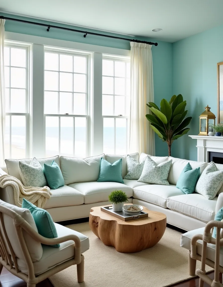 This charming seaside living room exudes a refreshing coastal vibe, painted in soft pastel blues that instantly evoke the feeling of a breezy beach day. A large, white sectional couch, adorned with fluffy aqua throw pillows and a knitted cream blanket, invites relaxation and comfort, positioned facing a stylish driftwood coffee table at the center. Light, airy sheer curtains billow softly around tall windows, allowing natural light to dance upon the bleached wicker accents throughout the space, including a pair of beachy rattan chairs flanking the coastal artwork hanging on pale blue walls. In one corner, a small lush green potted palm softens the room’s aesthetic, while nautical-themed decorations, like shell-patterned cushions and a vintage brass lighthouse lantern on the mantel, enhance the seaside charm.