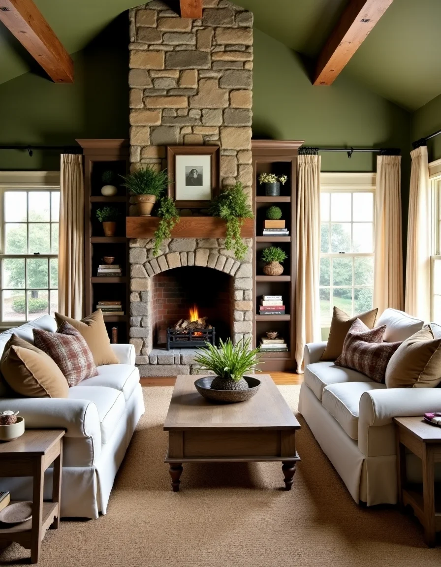 This inviting country-style living room exudes warmth and comfort, featuring a stunning, rustic stone fireplace as the focal point. The earthy tones of muted greens and deep browns are complemented by plush, oversized furniture; a deep-seated, cream-colored sofa adorned with plaid throw pillows sits adjacent to a reclaimed wooden coffee table. A set of elegant yet simple wooden bookshelves lined with well-loved books and country-themed decorations flank either side of the fireplace, while sheer linen curtains drape softly over farmhouse-style windows, letting in warm, natural light. A woven jute rug anchors the space, while hanging plants cascade down from distressed ceiling beams, adding a lively touch to this cozy retreat.