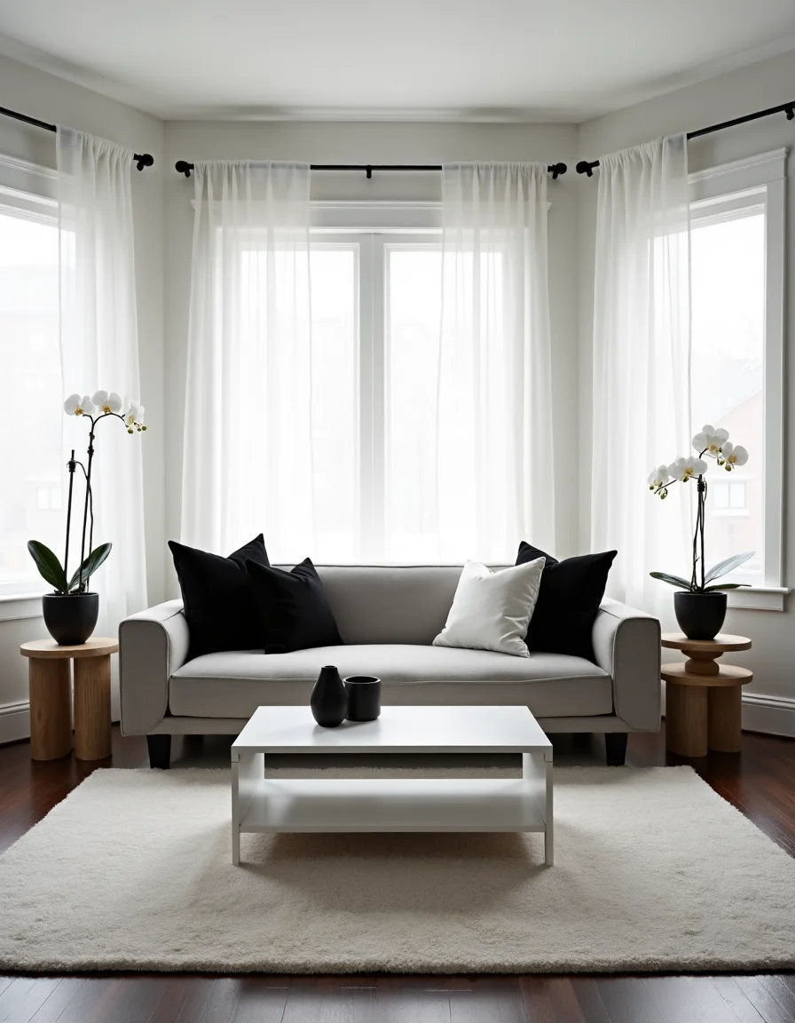 This minimalist living room embodies elegance with its subdued monochrome palette, where every element serves a purpose. A large, soft grey sofa with clean lines is placed centrally against the wall, adorned with a few black and white throw pillows that echo the serene aesthetic. In front of the sofa, a sleek white rectangular coffee table sits atop a plush, light grey area rug, providing a contrast against dark floorboards. A duo of minimalist wooden stackable side tables in natural wood are positioned on either side of the sofa, showcasing a simple black ceramic vase holding a single white orchid for a touch of softness. Large windows draped with sheer white curtains allow ample natural light to flood the space, further enhancing the tranquility that this minimalist room exudes.