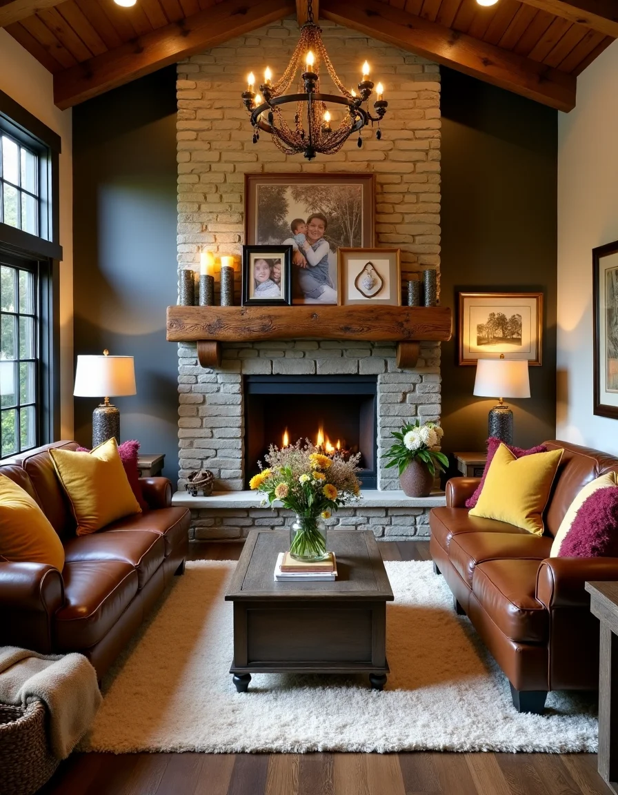 This inviting rustic living room exudes warmth and charm with its rich, earthy tones. The centerpiece is a large stone fireplace adorned with a hand-carved wooden mantel, decorated with various family photos in vintage frames and a collection of rustic candles flickering softly. A plush, cream-colored shag rug lies beneath a pair of oversized brown leather sofas that are scattered with mustard yellow and deep burgundy throw pillows made of soft wool. To one side, a reclaimed wood coffee table holds a vibrant arrangement of wildflowers in a mason jar, while beside it, a woven basket filled with luxurious blankets and faux fur throws invites relaxation. Warm lighting bathes the space from a wrought-iron chandelier overhead, complemented by table lamps featuring burlap shades, contributing to the cozy, homey atmosphere.