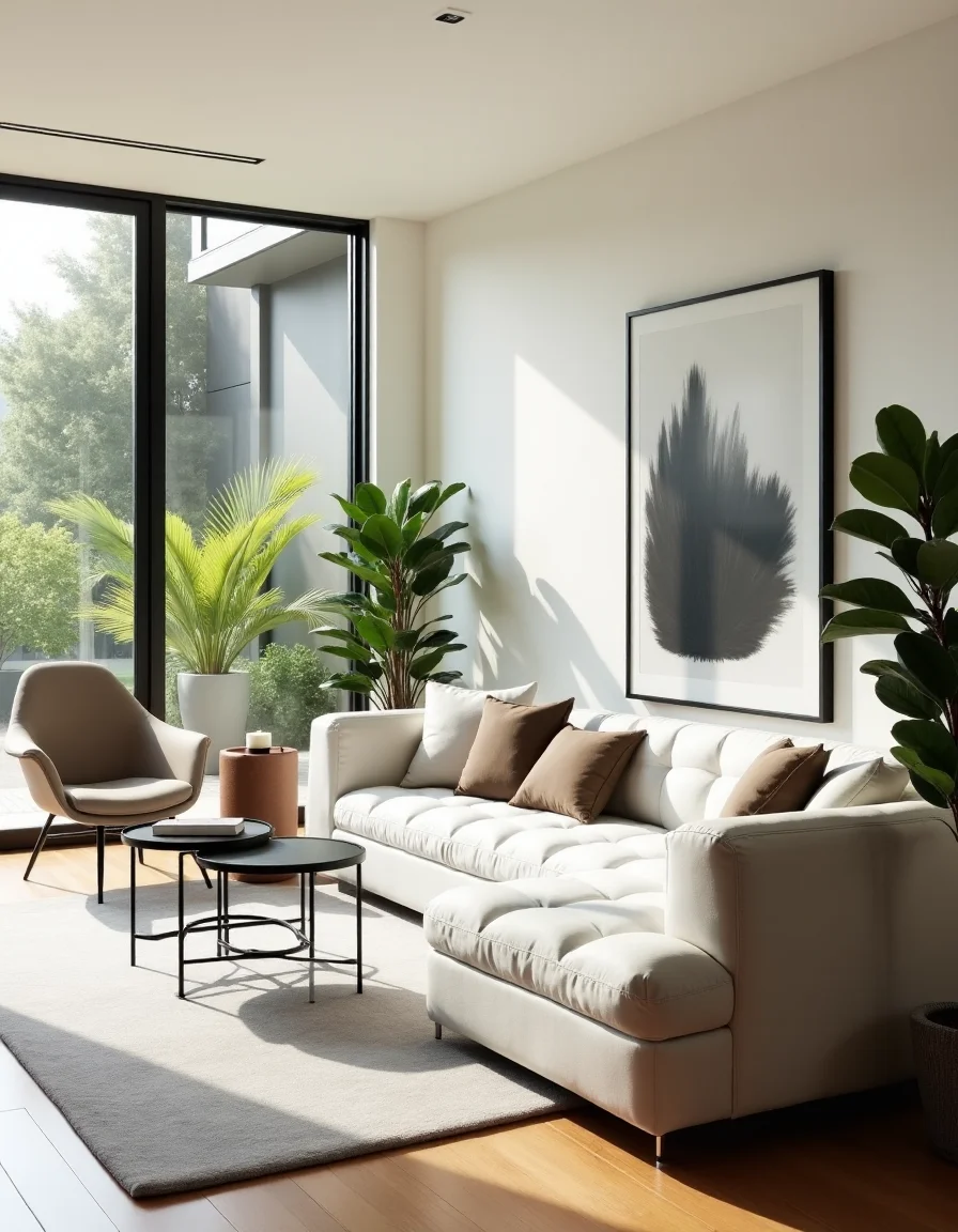 The living room embodies a sleek modern aesthetic with its open layout, featuring large floor-to-ceiling windows that allow natural light to flood in, enhancing the airy feel of the space. A plush, white sectional sofa with clean lines is positioned near the center, complemented by a minimalist glass coffee table that sits atop a soft light gray area rug. An elegant accent chair in a muted beige hue is placed in the corner, creating a cozy reading nook beside a tall, slender marble side table. The walls are painted in a soft off-white shade, adorned with abstract black-and-white artwork that brings a touch of sophistication, while several green potted plants strategically placed throughout the room soften the atmosphere, adding a natural element to the modern design.