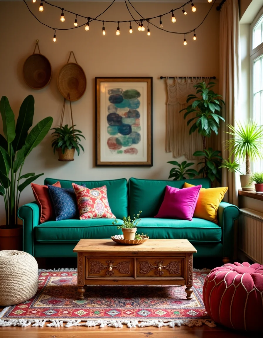 The living room exudes a vibrant bohemian flair, filled with a rich tapestry of colors and textures that bring each element to life. A plush, oversized emerald green sofa, adorned with an assortment of patterned throw pillows in fuchsia, mustard yellow, and deep indigo, creates a welcoming focal point. A low, distressed wooden coffee table, embellished with intricate carvings, sits at the center, surrounded by a scattering of textured poufs in shades of terracotta and cream. Along the walls, woven baskets and framed macramé art intermingle with potted plants, overflowing with greenery, while colorful rugs layered on the vintage hardwood floor knit the space together with warmth. Ethereal fairy lights hang festively above, casting a soft, inviting glow, creating a true sanctuary for relaxation and creativity.