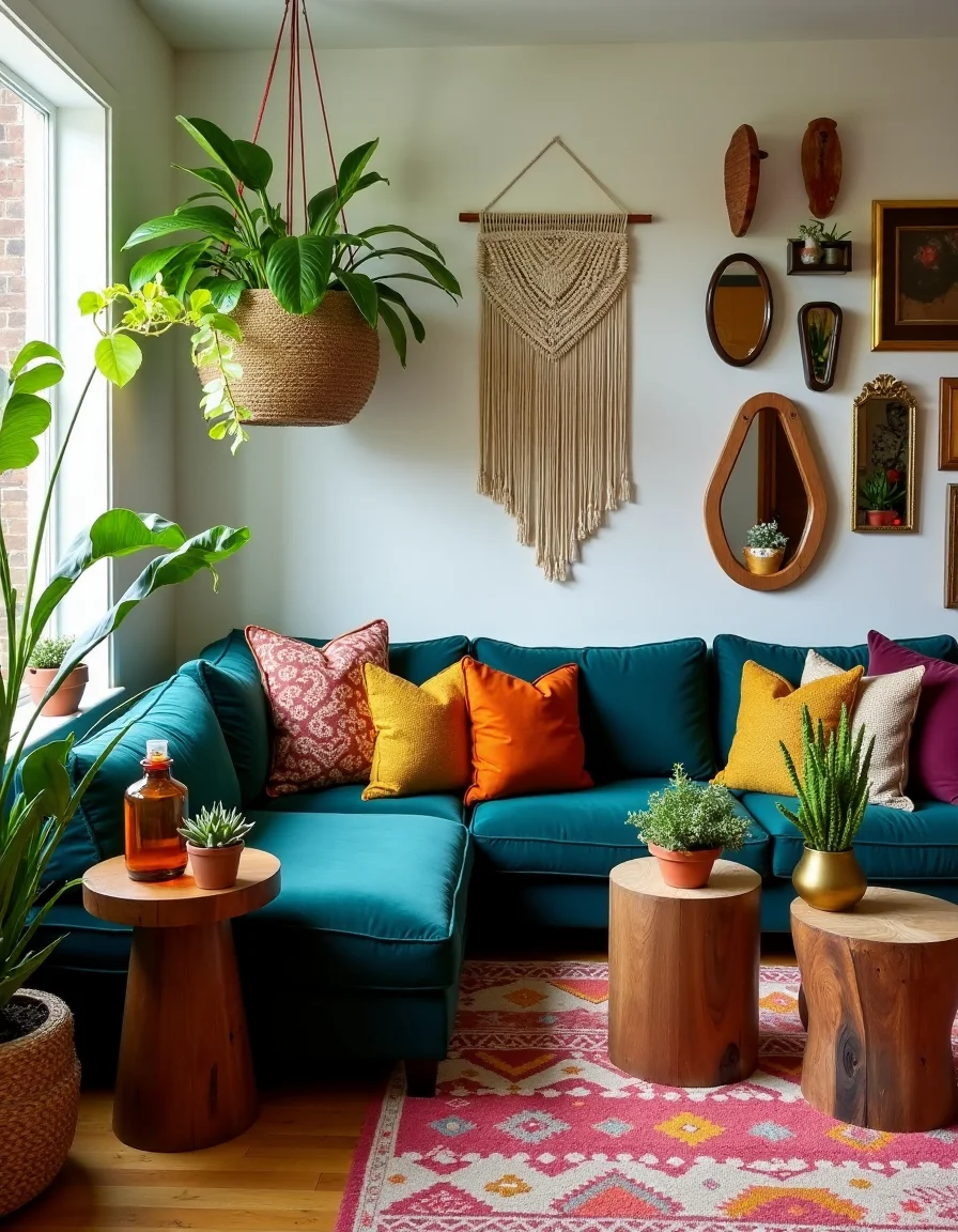 The living room is a vibrant oasis of bohemian charm, featuring a cozy, oversized, dark teal sectional sofa adorned with a mix of patterned throw pillows in shades of burnt orange, mustard yellow, and deep plum. A mismatched collection of wooden side tables, varying from reclaimed driftwood to vintage brass, provide a casual elegance, positioned cleverly to support various potted succulents and colorful glass vases. A macramé wall hanging hangs above the sofa, while an eclectic gallery wall filled with framed art, mirrors with unique shapes, and textile pieces brings an animated touch to the space. Lush greenery fills the room, with tall ferns and smaller snake plants nestled in wicker pots, adding life and color, while soft, textured area rugs in bold patterns define the seating areas, contributing to the welcoming atmosphere.