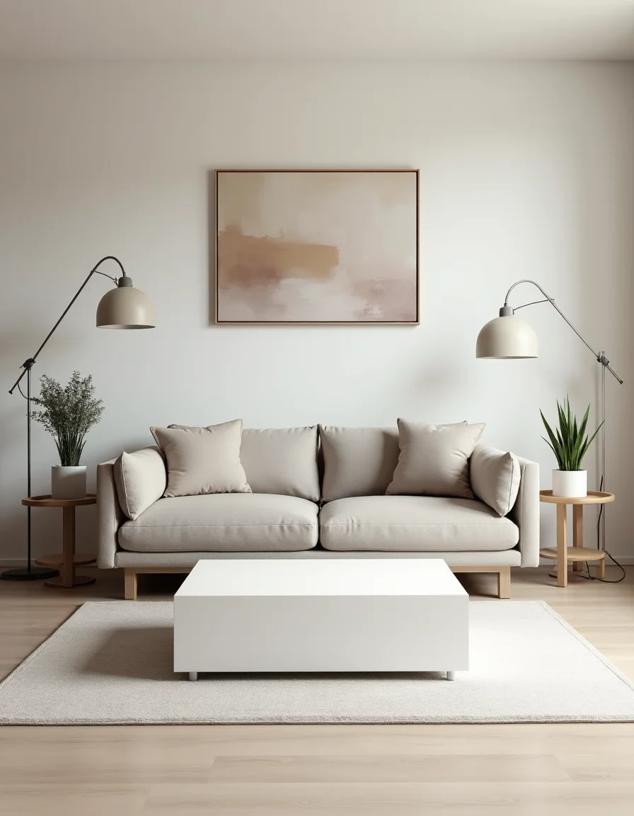 The living room embodies a minimalist style with a serene ambiance, showcasing a palette of soft grays, crisp whites, and subtle beige hues. A low, rectangular white coffee table made of sleek lacquered wood sits on a light gray area rug, centered in front of a cozy, modular sofa upholstered in a soft, textured fabric. Two unobtrusive floor lamps with thin, slender bases and simple white shades flank either side of the sofa, while a single piece of abstract art hangs above, featuring gentle tones that harmonize with the surroundings. The room is accentuated by carefully placed potted succulents on matching side tables, adding a touch of greenery while maintaining the clean lines and simplicity that define the minimalist aesthetic.