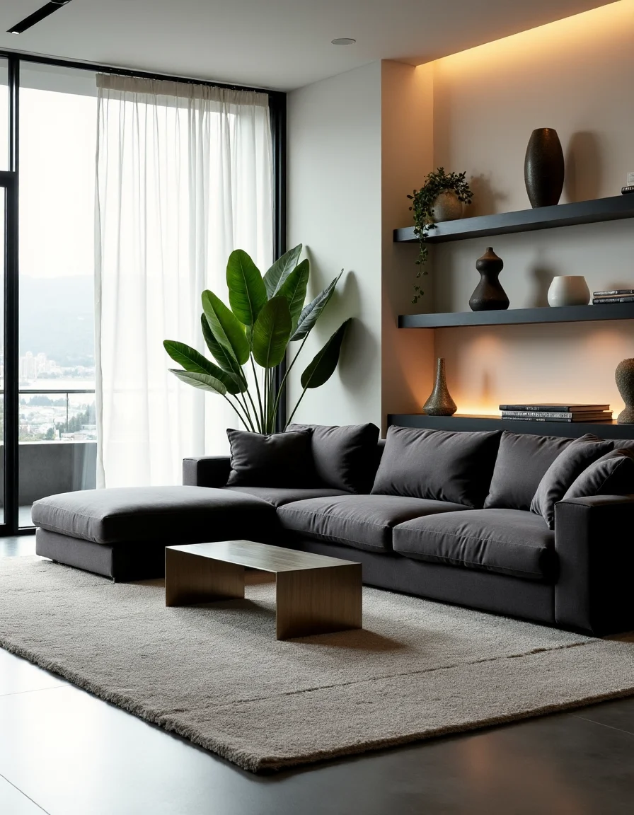 The living room showcases a modern aesthetic with a striking emphasis on clean lines and high-quality materials. A sleek, low-profile sectional sofa upholstered in a deep charcoal fabric sits centrally on a large, light gray, handwoven area rug, providing a cozy touch against the polished concrete flooring. Opposite the sofa, a minimalist coffee table made of tempered glass and brushed stainless steel complements the sophistication of the space. Behind the sofa, a collection of floating shelves display a curated selection of abstract sculptures and lush green plants, adding warmth and organic texture to the otherwise crisp environment. Large, floor-to-ceiling windows bathe the room in natural light, framed by sheer white curtains that softly diffuse the brightness while enhancing the open and airy feel.