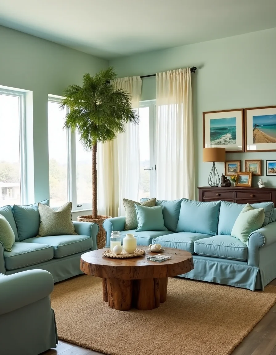 The living room is a serene seaside retreat, painted in soft shades of aqua and sandy beige, evoking the tranquil essence of a beach getaway. Plush, oversized sofas upholstered in a light blue fabric are arranged in a cozy U-shape around a rustic, driftwood coffee table, topped with a few frosted glass decorative pieces and seashells. A large, woven sisal rug anchors the seating area, enhancing the natural warmth of the space, while sheer white curtains flutter gently in the ocean breeze as sunlight spills in through expansive windows. To complement the ambiance, a tall potted palm tree stands in one corner, and on the opposite wall, a collection of framed beach photographs and nautical-themed artwork complete the decor, bringing a touch of the seaside indoors.