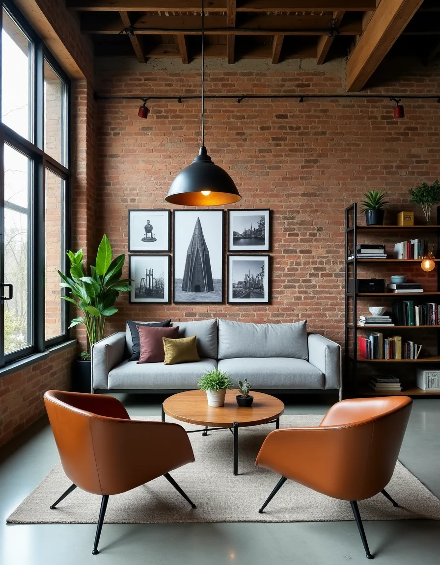 The living room features an open-concept layout characterized by exposed brick walls and polished concrete floors that set an industrial ambiance. A low-profile grey sectional sofa is paired with sleek leather accent chairs in a rich cognac hue, positioned around a reclaimed wood coffee table with metal legs that serves as a centerpiece. Above the sofa, a vintage pendant light hangs from a welded iron fixture, casting a warm glow over the space, while large windows framed with black metal allow natural light to flood in. A series of black-and-white photographs in minimalist frames line the walls, accentuated by a few potted succulents and a metal bookshelf filled with eclectic books and artifacts, adding character and depth to the overall design.