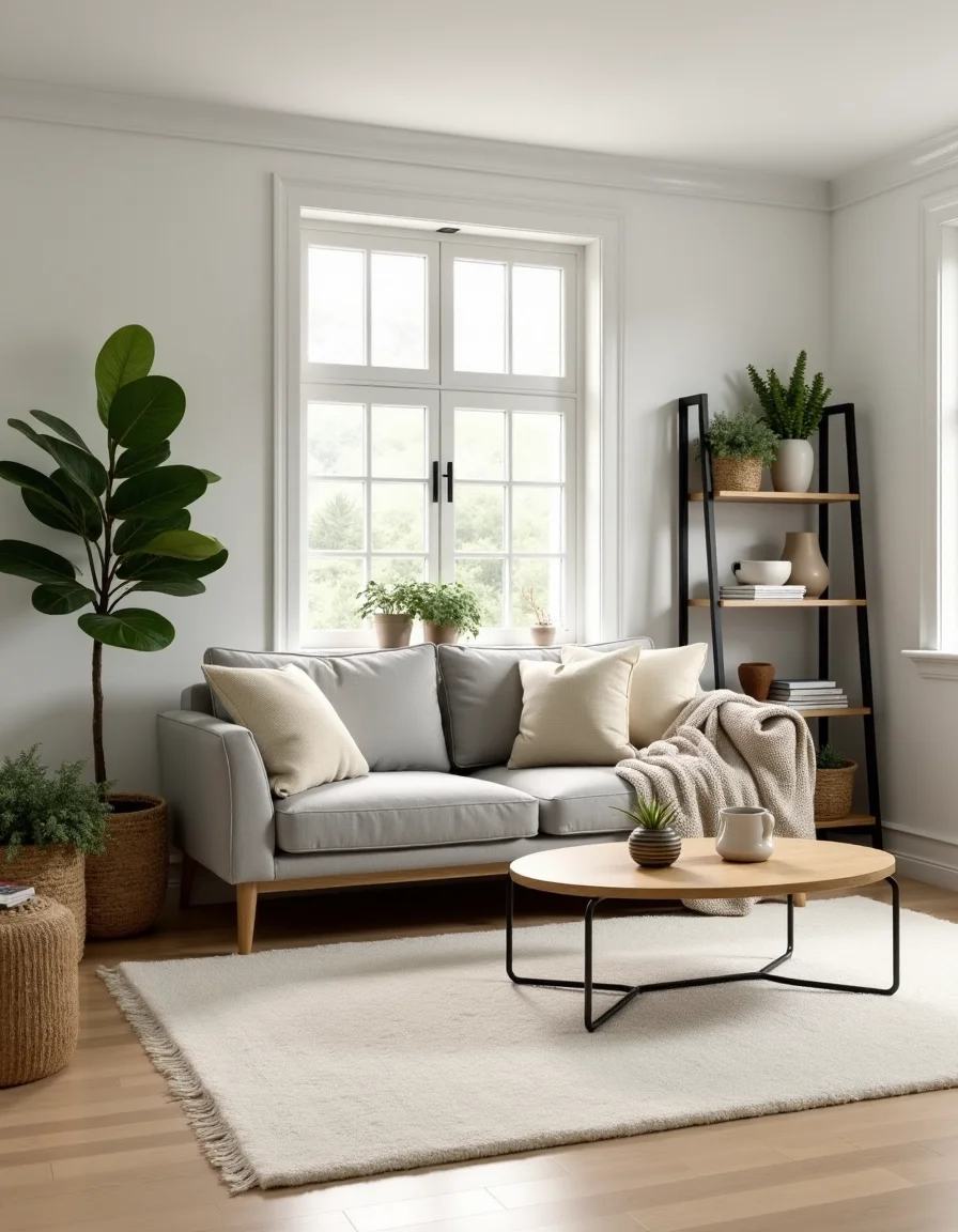 The living room features a bright and airy Scandinavian design, characterized by light wood floors and white walls that reflect natural light beautifully. A cozy, muted gray sofa is centrally positioned, adorned with soft, cream-colored throw pillows and a chunky knit blanket for added texture. Potted houseplants, including a tall fiddle leaf fig in one corner and smaller succulents on floating shelves, bring a vibrant touch of nature into the space. An oak coffee table with a sleek, minimalist design sits on a soft, off-white area rug, while a modern, geometric bookshelf showcases curated decorative items, pottery, and more greenery, enhancing the practical yet aesthetically pleasing ambiance of the room.