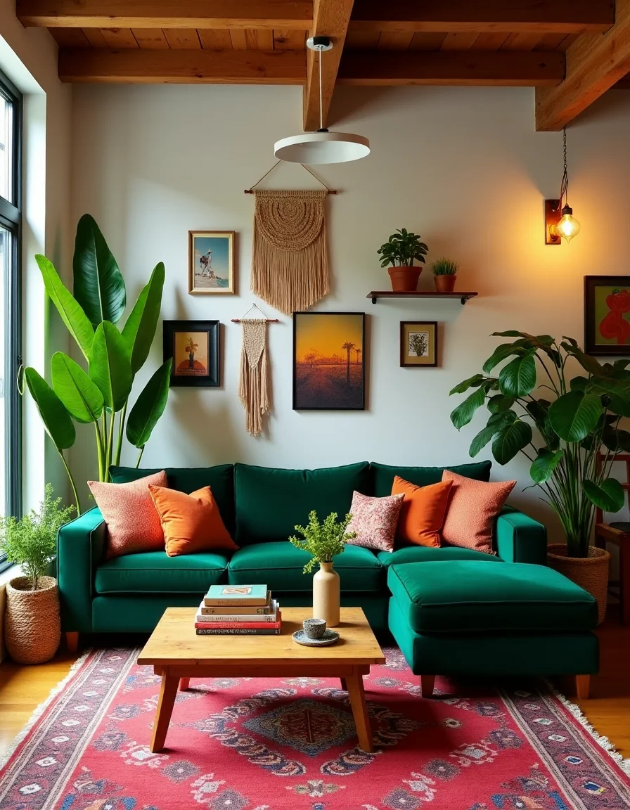The living room is a vibrant, bohemian retreat filled with an eclectic mix of textures, colors, and natural elements. A large, deep green velvet sectional sofa sits in the center, adorned with an array of mismatched throw pillows in warm earth tones and intricate patterns. Surrounding the sofa are a variety of potted plants, including tall floor palms, cascading pothos, and a vibrant monstera, each positioned in colorful woven baskets that enhance the boho aesthetic. On the walls, an assortment of wall art, including macramé hangings, abstract prints, and photographs in mixed frames, create a gallery feel, while a vintage wooden coffee table, topped with a stack of coffee table books and artisanal coasters, completes the inviting atmosphere. Bright, multi-colored area rugs layer the rustic hardwood floor, and warm pendant lights illuminate the space, creating a cozy, inviting ambiance perfect for relaxation and creativity.