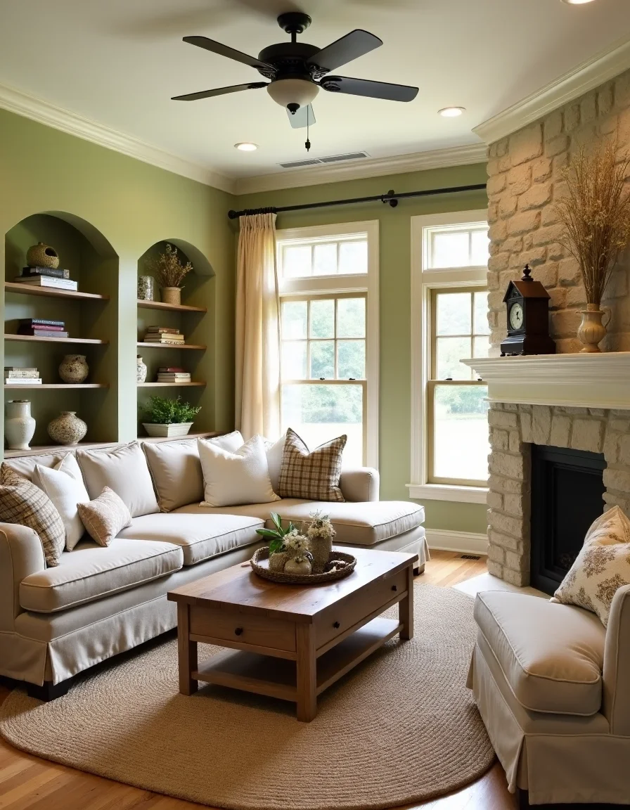 The living room exudes a cozy country charm with warm neutral tones, featuring a large, inviting L-shaped sectional sofa upholstered in soft, sandy beige fabric. The sofa is adorned with white slipcovers that add a touch of rustic elegance and are paired with several plump throw pillows in plaid and floral patterns, creating a welcoming atmosphere. A handcrafted wooden coffee table with a weathered finish is centrally placed, complementing a large braided jute area rug that accentuates the earthy aesthetic. Recessed bookshelves lined with trinkets and vintage books flank a large stone fireplace, upon which rests an antique clock and a selection of handmade ceramic vases filled with dried flowers. The walls are painted in a light sage green, enhancing the space's natural feel, while large windows draped with sheer linen curtains invite ample sunlight into the room, creating a bright and airy ambiance.