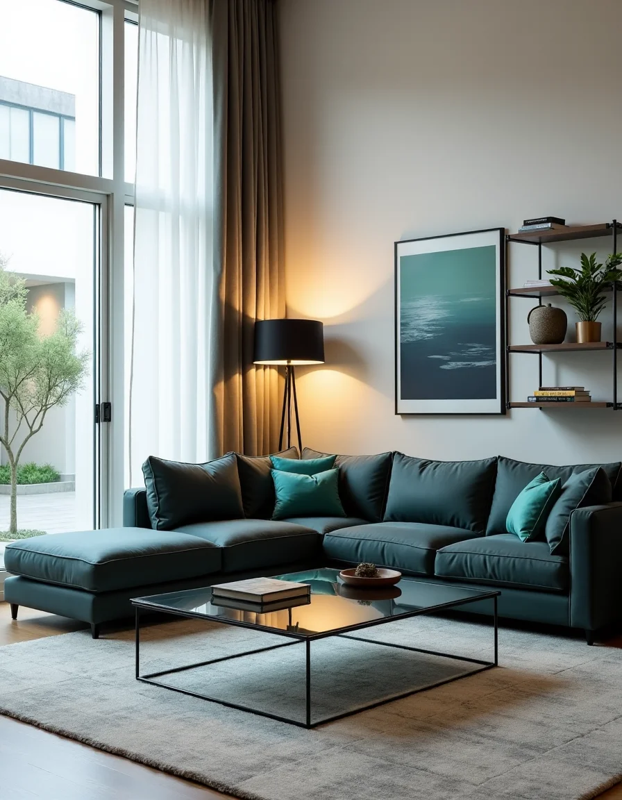 This modern living room features a spacious open layout, filled with natural light flowing through large floor-to-ceiling windows adorned with sheer white curtains. At the center, a sleek, low-profile sectional sofa in a deep charcoal matte fabric is complemented by a couple of glass accent tables that create a sense of openness. An oversized rectangular glass coffee table sits atop a plush, light gray area rug with a subtle geometric pattern, providing a perfect contrast to the darker furnishings. On the walls, abstract art pieces in cool tones of blue and green harmoniously echo the room's aesthetic while minimalist shelving holds curated decor items and a few potted succulents. A stylish matte black floor lamp stands in one corner, illuminating the space with warm light, further enhancing the modern inviting atmosphere.
