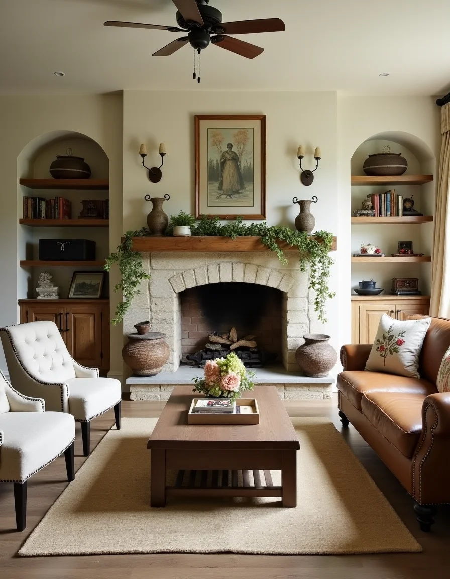 This charming country-style living room features a large rustic wooden coffee table, elegantly placed in the center and surrounded by a pair of tufted linen armchairs in soft beige. Opposite the coffee table, a vintage leather sofa offers a cozy seating area, accentuated with embroidered throw pillows showcasing subtle floral patterns. An inviting stone fireplace, adorned with a weathered wooden mantel, provides a warm focal point, flanked by tall, vine-draped bookshelves filled with well-loved books and quaint knickknacks. Soft neutral tones dominate the palette, complemented by earth-toned area rugs that anchor the space and sheer linen curtains that gently diffuse natural light, creating an ambiance of tranquility and comfort.