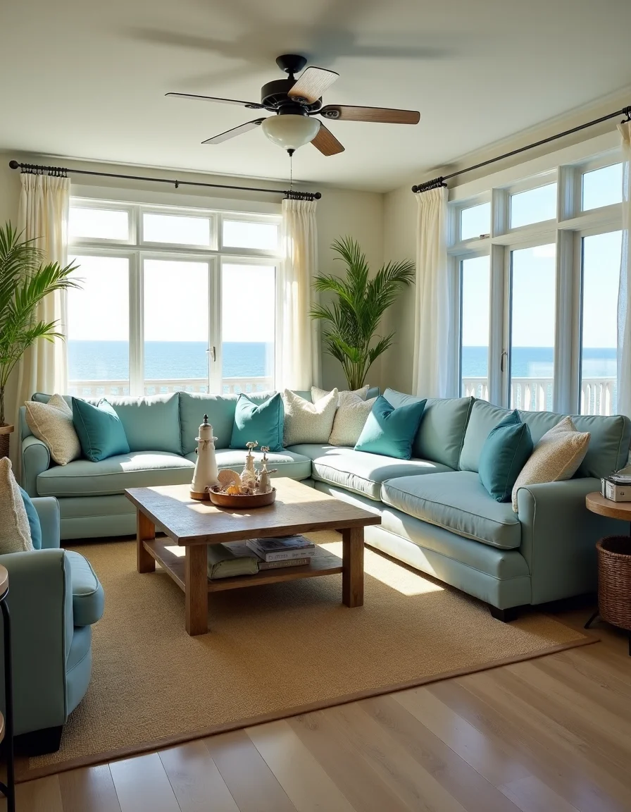 The living room is a serene seaside retreat, bathed in natural light from large, panoramic windows that frame picturesque ocean views. Soft, plush sectional sofas in a muted aqua blue are arranged invitingly around a weathered driftwood coffee table topped with nautical-themed decor, such as seashells and miniature lighthouses. A jute area rug lies beneath, adding a touch of earthy texture to the sandy-toned hardwood floor, while sheer white curtains flutter gently in the ocean breeze. To enhance the coastal vibe, potted palm plants are strategically placed in corners, and wall art featuring seascapes and beach scenes adorns the light, sandy-colored walls, creating an atmosphere of relaxation and tranquility.
