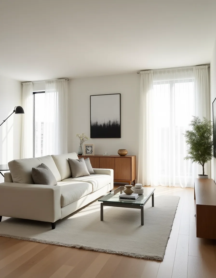 This minimalist living room embodies a serene and uncluttered design while showcasing an expansive sense of space. A large, plush white sectional sofa occupies the center, adorned with a few strategically placed light gray throw pillows that add subtle texture without overwhelming the palette. Positioned next to the sofa is a sleek, low-profile glass coffee table, reflecting natural light that pours in through a floor-to-ceiling window dressed in sheer white curtains. The room features a single black-and-white abstract artwork hung above a decorative console table made of smooth oak, which displays a few curated decor items, such as a minimalist clock and a small, lush potted plant, infusing a touch of life into this tranquil atmosphere. Natural wood features, including light oak flooring and a few wooden accents in furniture, harmonize beautifully with the neutral tones and amplify the overall elegance of the space.
