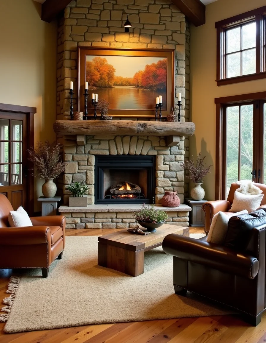 The living room exudes a warm, rustic charm, centered around a large stone fireplace adorned with a weathered wooden mantel. A hand-woven, cream-colored rug sprawls across the warm, oak floor, providing a cozy foundation for a pair of oversized leather armchairs and a tufted dark brown sofa, draped with faux fur throws. Above the fireplace, a collection of vintage wrought iron candle holders creates an inviting ambiance, while a large, framed landscape painting featuring autumnal hues hangs on the wall, enriching the earthy aesthetic. Decorative accents, such as ceramic pottery filled with wildflowers and a reclaimed wood coffee table bearing the marks of time, complete this inviting retreat, making it an ideal gathering space amidst nature-inspired textures and colors.