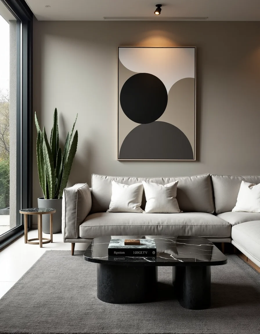 The living room exudes a modern aesthetic characterized by a sleek and sophisticated design. A large, matte grey sectional sofa is anchored in the center, adorned with plush white cushions that invite comfort. To complement the sofa, a refined black marble coffee table with subtle veining elegantly occupies the space, framed by a pair of minimalist chrome side tables on either side, showcasing contemporary sculptural decor. Floor-to-ceiling windows flood the room with natural light, highlighting the matte finish of the walls in a soft taupe shade, while a strategically placed abstract art piece, featuring bold geometric shapes in monochrome colors, enhances the contemporary flair. Potted succulents and a plush area rug in a muted charcoal tone create warmth, softening the edges of the modern furnishings in this tranquil living space.