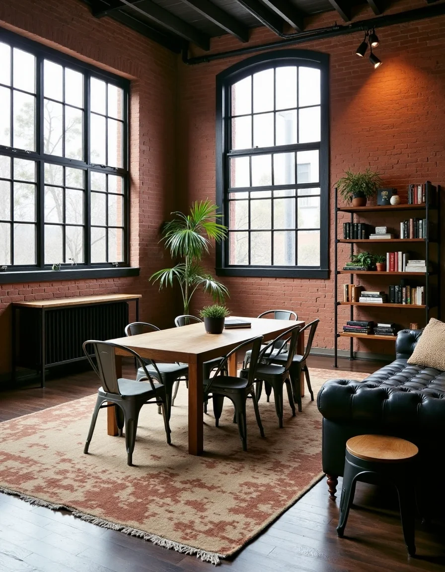 The living room embodies an industrial chic aesthetic, featuring soaring ceiling windows that flood the space with natural light, accentuating the raw beauty of exposed brick walls in a warm clay hue. In the center, a solid reclaimed wooden table with a rustic finish is surrounded by mismatched metal chairs, their distressed surfaces adding character and charm. On one side, sleek iron shelves hold a curated collection of vintage books, potted succulents, and retro decor items, while a large, tufted leather couch in a deep charcoal color invites comfort along the opposite wall. The floors are adorned with a large, distressed kilim rug in earthy tones, which softens the industrial feel and grounds the open space, creating a cozy focal point amidst the edgy design elements.