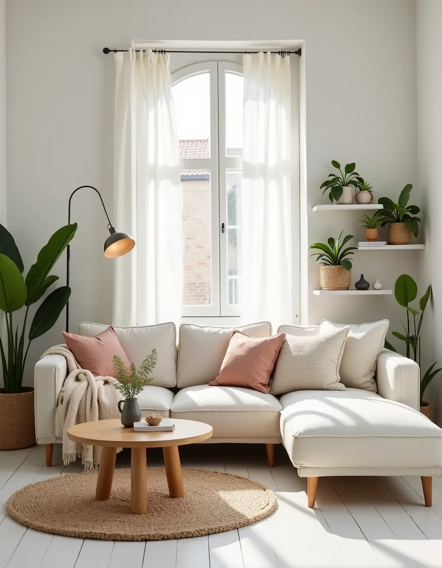 The living room is a serene Scandinavian oasis, adorned with soft, pale tones of white and light grey. A plush, off-white sectional sofa is positioned in the center, accented by cozy throw blankets in muted pastels and a cluster of textured pillows in varying shades of soft beige and blush. A natural wood coffee table rests atop a light jute area rug, complemented by minimalist decor items, including a small vase with fresh eucalyptus and handmade ceramic coasters. Bright green potted plants, such as snake plants and peace lilies, are strategically placed in corners and on shelves, harmonizing the space with a touch of nature and enhancing the airy feel of the room. Warm ambient lighting emanates from a stylish tripod floor lamp, providing a welcoming glow for evening relaxation.