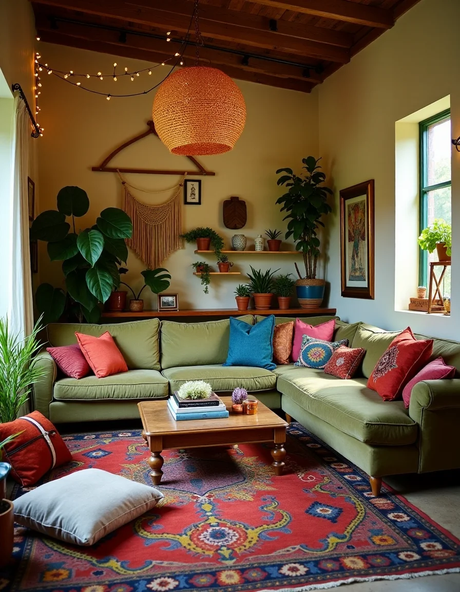 The living room is a vibrant bohemian oasis, adorned with a medley of textures and colors. A large, richly patterned area rug in deep rust and teal patterns anchors the space, while an array of mismatched furniture invites comfort and conversation; a vintage, low-slung wooden coffee table sits atop the rug, surrounded by a collection of floor cushions in earth tones and eclectic fabrics. A large, plush sectional sofa in a soft, muted olive green dominates one corner, draped with colorful throws and adorned with an assortment of handwoven pillows. The walls are hung with an eclectic gallery of framed art, macramé wall hangings, and shelves showcasing an assortment of houseplants in terracotta pots, adding life to the ambiance. Warm, ambient lighting cascades from string lights and a rattan pendant lamp overhead, casting a cozy glow that enhances the inviting atmosphere.