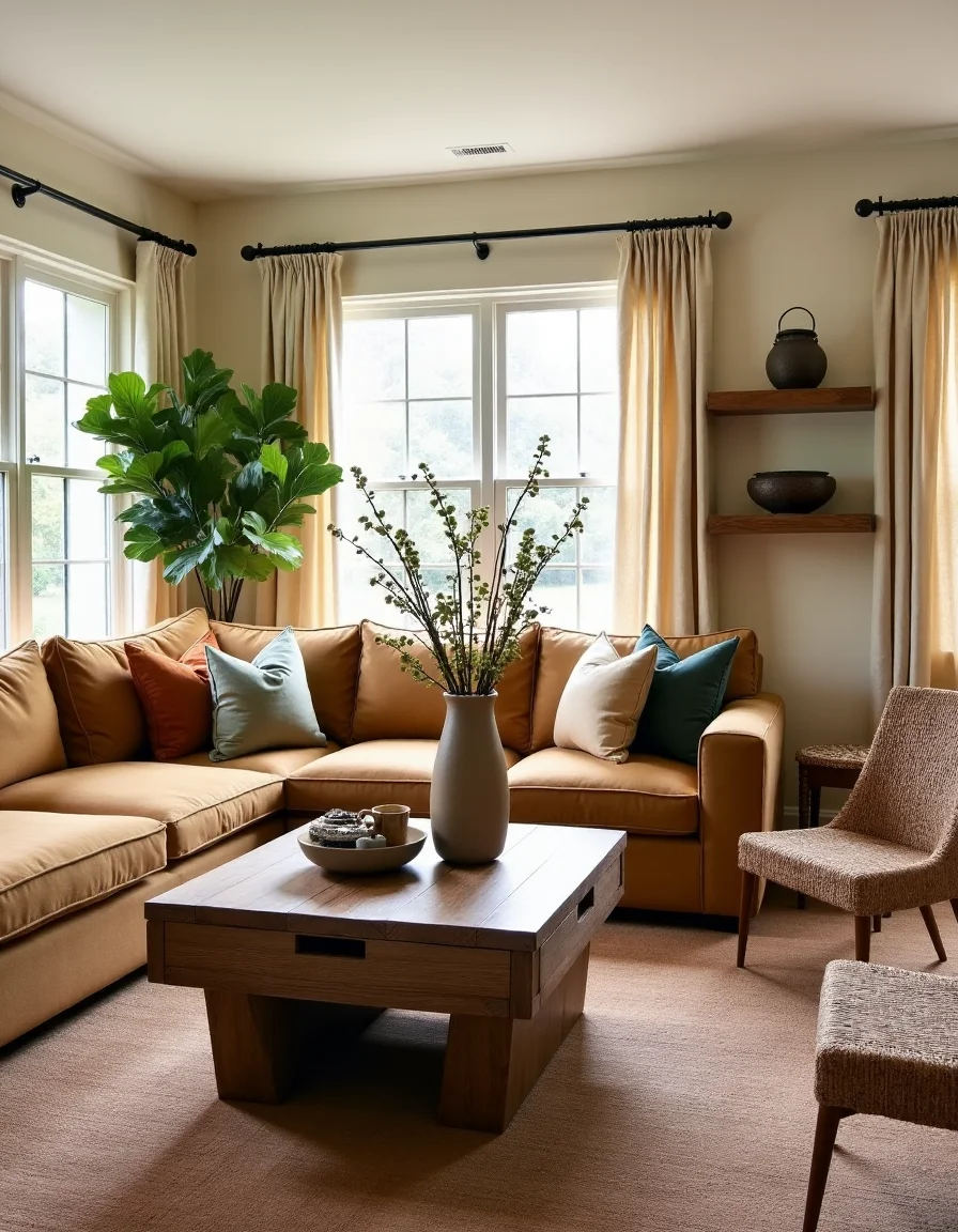The living room emanates a cozy rustic charm, featuring a large, L-shaped sectional sofa upholstered in a warm taupe wool blend, adorned with an array of handmade throw pillows in earthy tones of burnt orange, deep green, and soft beige. A reclaimed wood coffee table stands centrally, showcasing artisanal decor like a hand-thrown ceramic vase filled with dried eucalyptus branches and a set of vintage leather coasters. Layered textiles abound, with a handwoven area rug anchoring the space, its fibers blending rich browns and creams, flanked by two woven seagrass chairs on either side. Natural elements are emphasized with live-edge wooden shelves that display an eclectic mix of local pottery and rustic lanterns, while large windows dressed in heavy linen drapes let in soft, diffused light, enhancing the room's inviting farm-style atmosphere.