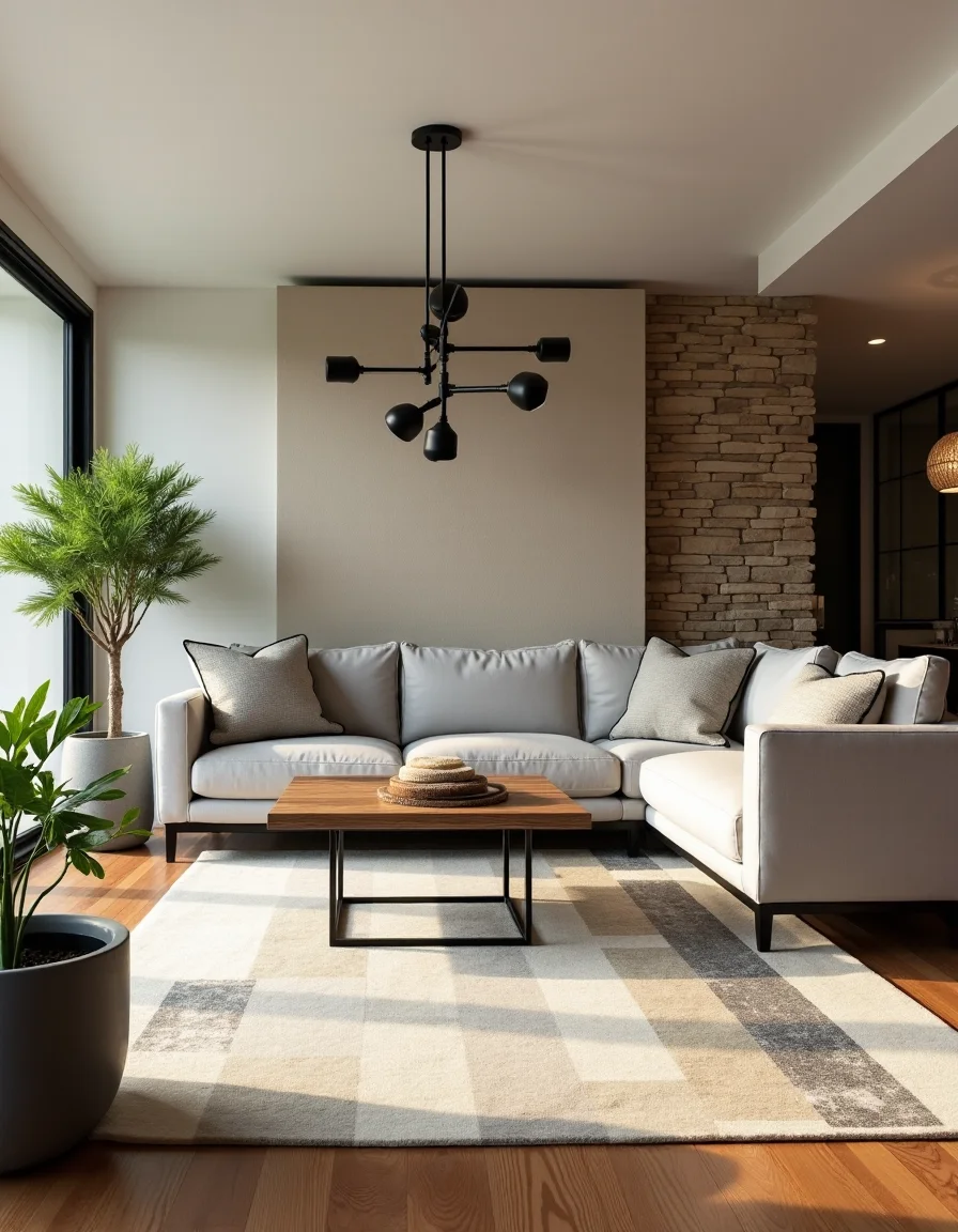 The living room embodies modern elegance with a harmonious blend of natural materials. A sleek, light gray fabric sectional sofa is centered on a rich walnut hardwood floor, surrounded by an oversized area rug featuring geometric patterns in soft beige and charcoal. To the left, a mid-century inspired coffee table in reclaimed wood showcases intricate grain patterns, while above it, a cluster of matte black metal pendant lights creates a striking focal point from the ceiling. Flanking the sofa are two minimalist concrete planters, each housing a lush fern, introducing a touch of vitality against the clean lines of the furniture. A feature wall adorned with stacked stone tiles in warm tones adds a rustic contrast to the space, enhancing the modern aesthetic with layers of texture and warmth.
