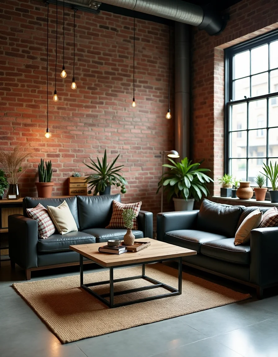 The living room radiates an industrial charm, featuring a backdrop of exposed brick walls and polished concrete flooring. A large, reclaimed wood coffee table sits at the center, with a matte black metal frame that complements the rugged aesthetic. Two deep charcoal gray leather sofas accentuate the seating area, adorned with a mix of plaid and geometric patterned throw pillows in earthy tones. An industrial-style floor lamp with a brushed steel finish stands beside an oversized window, further illuminating the space that is enriched with hanging pendant lights made from repurposed pipes. Various potted succulents and a vintage wooden crate filled with books add touches of warmth and character to this modern yet rustic sanctuary.