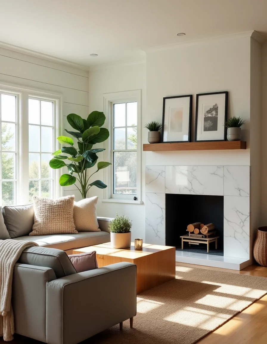 The living room exudes a cozy Scandinavian charm, characterized by its bright color palette and use of natural materials. A soft, light gray sectional sofa drapes across one side of the space, adorned with chunky knit throw pillows in shades of cream and muted pastels. In front of the sofa, a rustic wooden coffee table with a smooth, natural finish sits atop a beige woven area rug that introduces warmth to the room. A set of floor-to-ceiling windows lets ample sunlight flood in, illuminating the white shiplap walls and highlighting potted greenery, including a tall fiddle leaf fig tree in one corner and smaller plants on floating wooden shelves. The ambiance is completed with a sleek, minimalist fireplace made of white marble, flanked by cylindrical concrete planters and modern art prints in simple black frames hanging above, creating a joyful, inviting atmosphere perfect for relaxation and gatherings.
