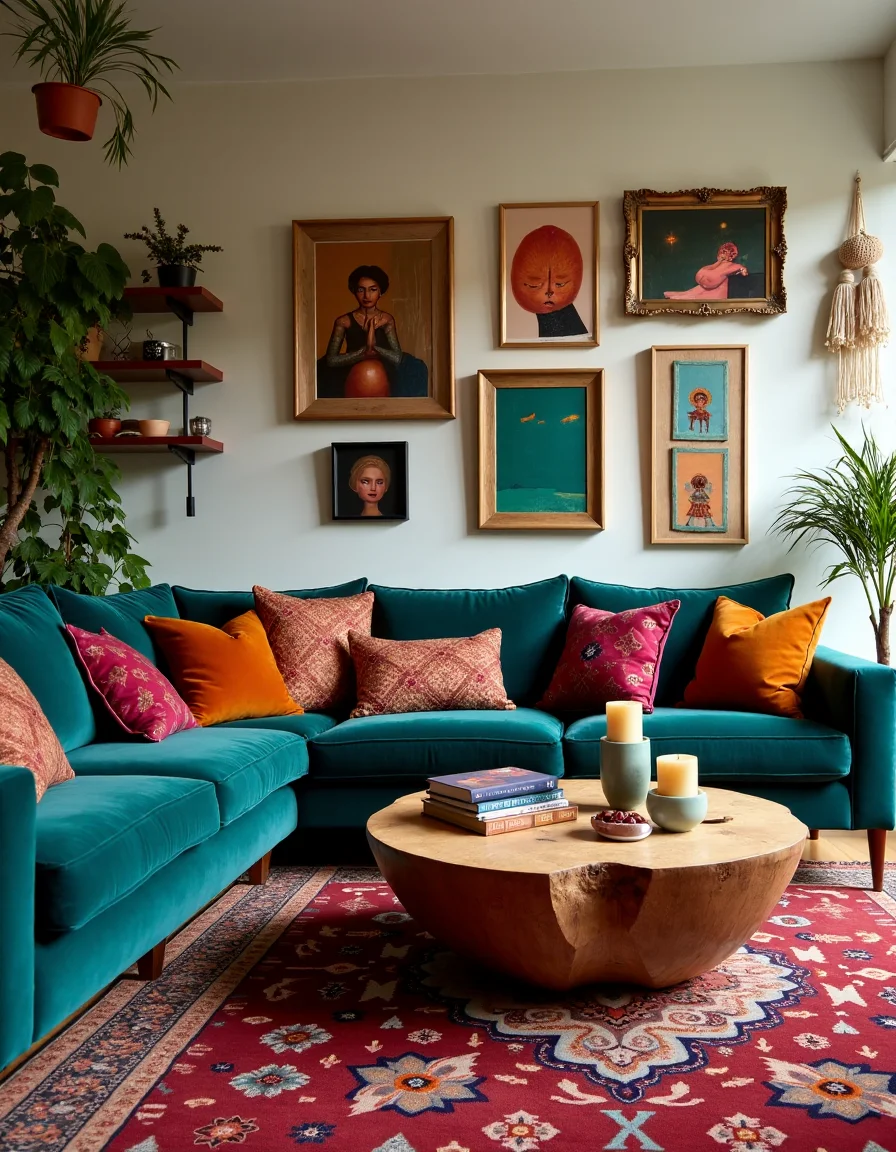The living room is an eclectic mix of vibrant hues and textures, embodying the true essence of bohemian style. A large, plush sectional sofa dressed in deep teal velvet occupies the center, adorned with an array of embroidered pillows in rich jewel tones of ruby, amber, and emerald, providing a cozy and inviting atmosphere. Beneath the sofa lies a stunning, oversized ornamental carpet featuring intricate patterns in shades of rust, mustard, and navy, grounding the space. On the walls, an assortment of framed paintings presents a delightful gallery of abstract art, floral motifs, and travel-inspired photography, punctuated by macramé wall hangings that add depth and dimension. Potted plants cascade from a wooden shelf and hang in the corners, infusing the room with fresh greenery and tie the organic look together, while a boho-chic coffee table made of reclaimed wood sits in front, serving as a base for colorful books, candles, and handmade ceramic coasters.