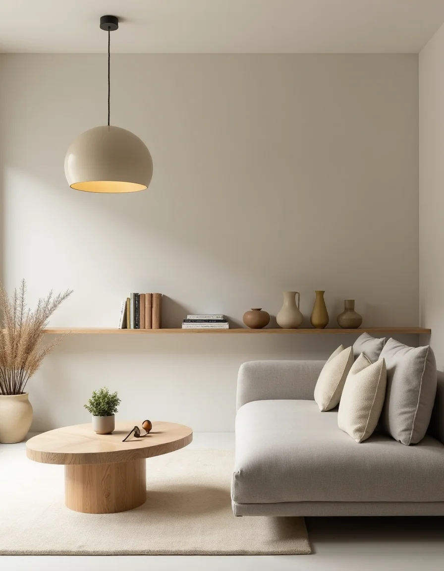 The minimalist living room exudes an air of calm with its subtle, neutral color palette comprised of soft whites and warm beiges. Centered in the space is a sleek, low-profile modular sofa upholstered in durable, light gray fabric, adorned with just a couple of textured pillows for comfort. To the left, a minimalist coffee table made from a singular slab of white oak complements the space, adorned only with a small potted succulent, emphasizing the design's functional simplicity. A large wall-mounted shelf displays select decor items—carefully curated books and a few geometric vases—maintaining an uncluttered aesthetic. The lighting fixture overhead is a simple, off-white pendant light, casting a warm glow that invites relaxation and enhances the room's tranquility while still prioritizing functionality with adjustable brightness settings.