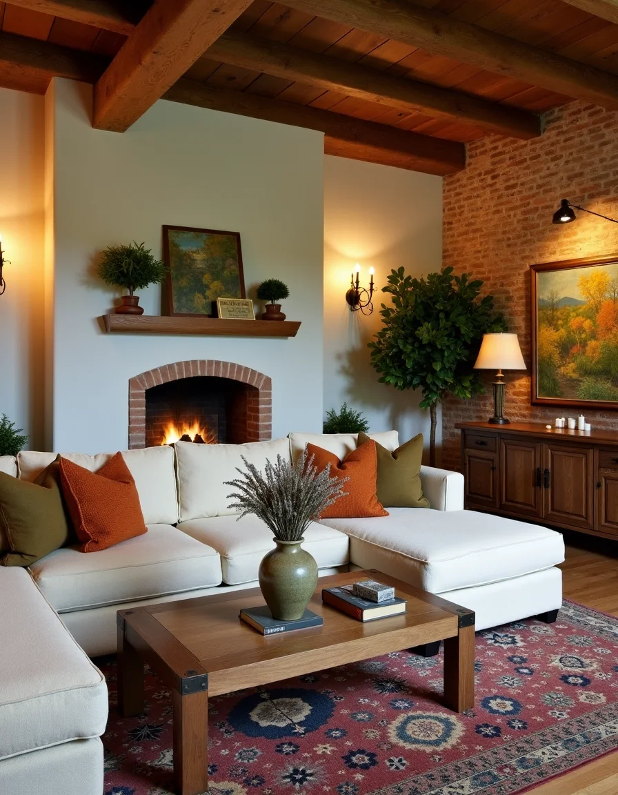 The living room exudes rustic charm with its exposed wooden beams and a delightful mix of earthy tones. A large, inviting cream-colored wool sectional sofa, adorned with textured throw pillows in shades of burnt orange and forest green, anchors the room in front of a stone fireplace that crackles cozily, casting a warm glow. In front of the sofa, a reclaimed wood coffee table, accentuated with decorative elements such as a rustic ceramic vase filled with dried lavender and a few well-loved books, adds character and functionality. Soft, ambient warm lighting emanates from wrought iron sconces on the walls and a vintage-style floor lamp beside a hand-knotted Persian rug, complementing the exposed brick wall adorned with nature-inspired art that emphasizes the naturalistic aesthetic. Potted plants in handcrafted earthenware planters breathe life into the space, while a wooden sideboard houses an assortment of rustic knickknacks and candles, enhancing the overall inviting atmosphere.