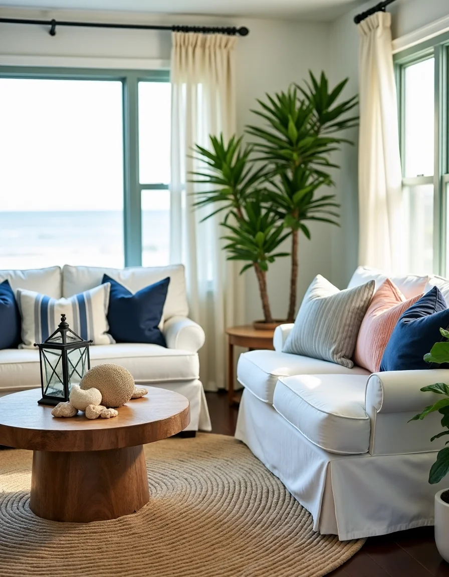 The living room exudes a calming seaside ambiance, dominated by soft shades of ocean blue and sandy beige. A cozy white slipcovered sectional sofa, accented with navy blue and coral-striped throw pillows, is positioned to the left, complemented by a rustic driftwood coffee table adorned with seashells and a weathered lantern. Light, sheer curtains billow gently in the sea breeze, allowing sunlight to flood the room, while a large, braided jute area rug with a subtle striped pattern grounds the space. In the corners, a pair of tall potted palm plants adds a vibrant touch of greenery, while nautical-themed wall art showcasing sailboats and tranquil beaches completes the serene decor.