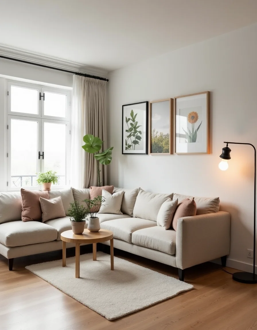 The living room is a serene retreat designed in a Scandinavian style, featuring pale tones of white and soft grey that create an airy ambiance. A light oak hardwood floor anchors the space, while a plush, off-white area rug adds warmth underfoot. A cozy sectional sofa, upholstered in a muted beige fabric, is adorned with a mix of textured throw pillows in soft pastels and earth tones. On one side, a slender wooden coffee table made from reclaimed wood holds a few carefully placed houseplants in minimalist ceramic pots, contributing to the natural feel of the room. Large windows draped in sheer linen curtains invite natural light, highlighting a curated wall gallery of nature-themed art and photographs, harmoniously framed in light wood. Alongside, a simple black metal floor lamp with a warm LED bulb casts a gentle glow in the evenings, creating an inviting atmosphere perfect for relaxation.