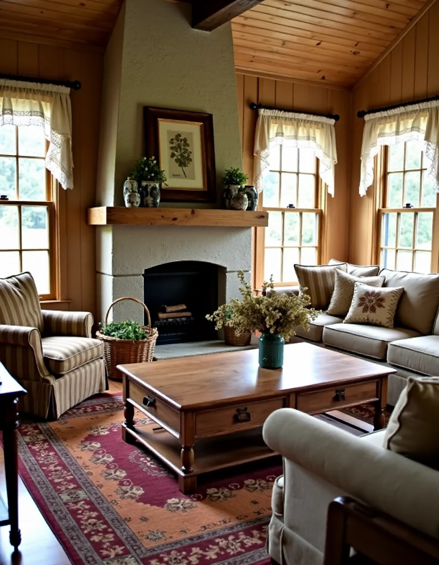 This cozy country-style living room embodies warmth and natural charm, featuring walls adorned with weathered wood paneling that enhances the rustic feel. A central stone fireplace, with a rough-hewn wooden mantle plate, creates a focal point surrounded by soft seating options—two deep-cushioned, plaid upholstered armchairs and a large sectional sofa in a muted beige linen, all invitingly arranged in a semi-circle. Ample natural light pours in through large, paned windows dressed with delicate lace curtains, illuminating the earthy tones throughout. To complete the ambiance, a wooden coffee table boasting intricate carvings is adorned with a bouquet of wildflowers in a mason jar, while woven baskets placed strategically around the room house cozy throws and additional cushions. A vintage area rug with rich hues of burgundy and ochre defines the seating area, enhancing the sense of comfort and bringing all the elements together harmoniously.