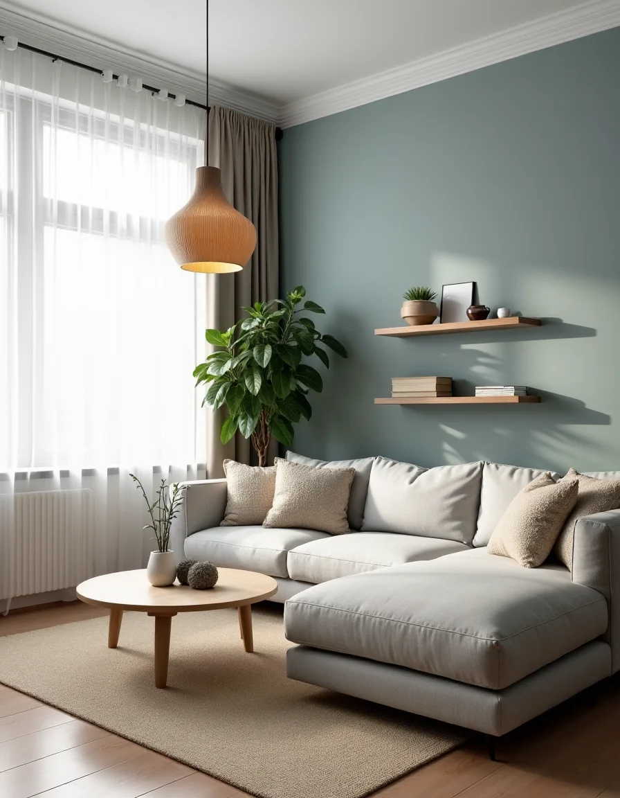 The living room embodies a serene Scandinavian design, centered around a comfortable light gray sectional sofa with textured cushions, arranged to invite conversation. A pale wood coffee table, featuring clean lines, sits atop a soft, woven cream area rug, providing warmth underfoot. Floor-to-ceiling windows draped in sheer white curtains allow abundant natural light to filter in, highlighting the subtle pale blue accent wall that adds a touch of color without overpowering. In the corner, a tall indoor plant in a sleek ceramic pot introduces a refreshing element of nature, while shelves adorned with minimalistic decor, books, and handmade ceramics contribute to the functional yet stylish ambiance. Ambient lighting is provided by an elegant pendant light with a natural wood finish, casting a gentle glow over the space and enhancing the cozy atmosphere.