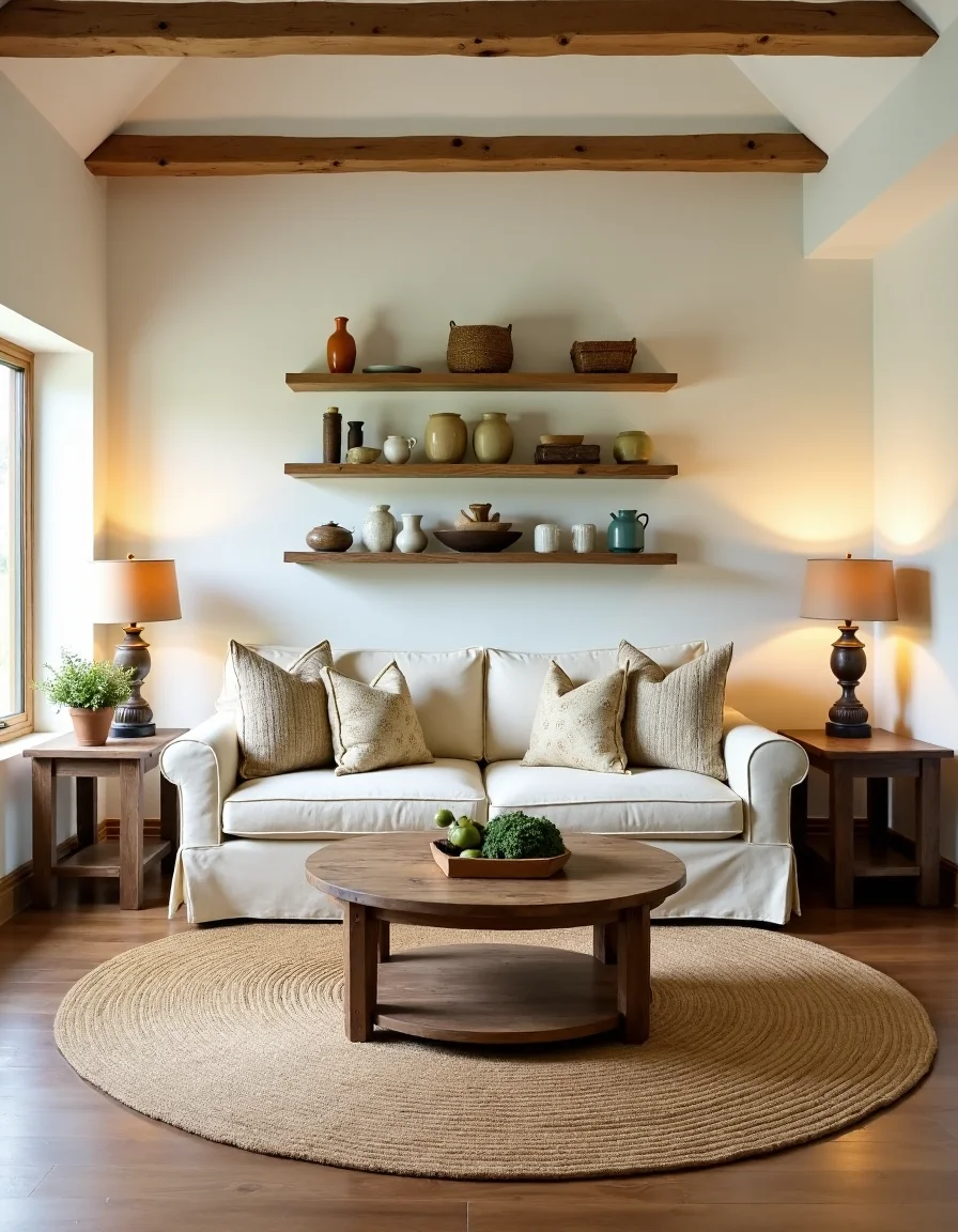 The living room exudes a warm and inviting country style, with soft neutral tones enveloping the space. A plush, cream-colored slipcovered sofa anchors the room, flanked by two rustic wooden side tables, one adorned with a small potted fern and the other holding an antique lamp with a warm glow. A braided jute area rug rests beneath a circular farmhouse-style coffee table, creating a cozy focal point, while an assortment of patterned throw pillows in shades of beige, taupe, and soft greens adds a touch of texture. Open wooden beams stretch across the ceiling above, complemented by wall-mounted shelves displaying handcrafted ceramics and woven baskets, enhancing the ambiance of relaxed country charm.
