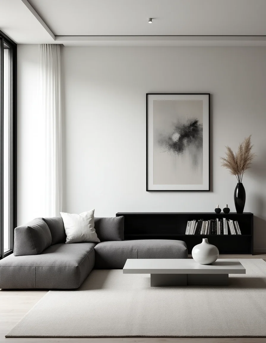 The living room embodies a striking minimalist aesthetic with a predominately monochrome color palette of whites, blacks, and grays, allowing for ample negative space that draws the eye outward. A sleek, low-profile sectional sofa upholstered in a soft charcoal fabric is positioned languidly against a light gray wall, its cushions plump yet understated, complemented by a single, oversized white throw pillow gently placed on one end. In front of the sofa, a simple white coffee table with clean lines holds a delicate ceramic vase, featuring a single stem of a minimalist arrangement of dried grass, emphasizing the beauty of simplicity. To one side, a narrow black bookshelf, flush with the wall, showcases a curated collection of art books, while a single framed abstract black-and-white print hangs above, giving just the right touch of character without overwhelming the space. Large windows drape floor-to-ceiling, dressed in sheer white curtains that softly diffuse the abundant natural light, contributing to the airy feeling of the room.