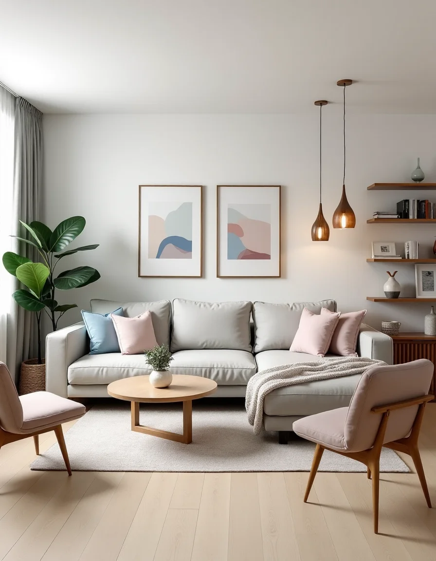 The living room is a serene oasis characterized by its Scandinavian style, featuring a light ashwood floor that seamlessly blends with the walls painted in a soft, matte white. A large, plush light grey sectional sofa is positioned in the center of the room, adorned with pastel-colored throw pillows and a chunky knit blanket draped over one arm. A minimalist coffee table made of natural oak sits on an airy, neutral-toned area rug, surrounded by two modern accent chairs in muted blush fabric. In one corner, a tall indoor plant, such as a fiddle leaf fig, adds a touch of greenery, while hanging from the ceiling are warm, ambient pendant lights with wooden accents, creating an inviting and cozy atmosphere. The walls are adorned with framed abstract prints that use soft blues and pinks, enhancing the room's bright and calm aesthetic, complemented by wooden shelves displaying a curated selection of books and decorative accessories.
