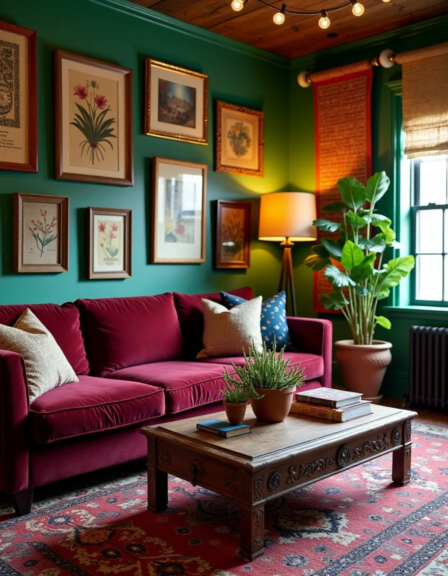 The living room exudes an eclectic bohemian vibe, featuring an array of colorful, ornamental carpets layered on a hardwood floor that create warmth and texture. A large, comfortable deep-seated sectional couch upholstered in rich burgundy velvet is adorned with mismatched decorative pillows in vibrant patterns—some featuring paisley and others geometric designs. Above the couch, an inviting gallery wall showcases an array of framed artwork that includes abstract prints, vintage-inspired canvases, and a tapestry woven with natural fibers, all arranged in a seemingly random yet artistically balanced fashion. An antique wooden coffee table with intricate carvings sits at the center, topped with an assortment of succulents in terracotta pots and stacked books, while a large, leafy potted plant stands elegantly in one corner to enhance the room's organic ambience. Soft, dim lighting from a distressed brass floor lamp and string lights draped across the window add a cozy glow, inviting relaxation in this beautifully curated space.