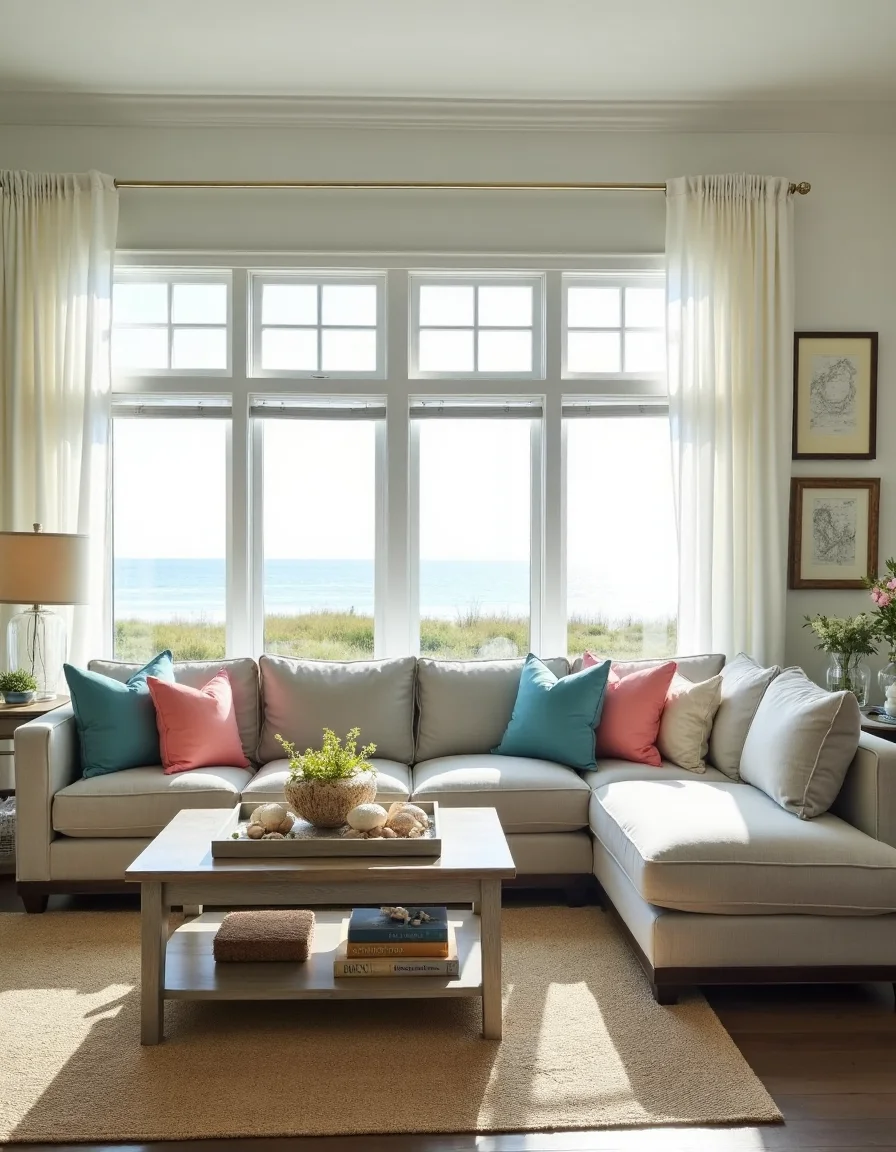 This spacious seaside living room flows effortlessly with an abundance of natural light streaming through large, floor-to-ceiling windows adorned with sheer white linen curtains that softly billow with the gentle ocean breeze. The focal point is a plush, light gray sectional sofa, accented with various throw pillows in oceanic tones of aqua, sandy beige, and coral pink. A distressed-wood coffee table sits at the center, topped with a cluster of seashells and a driftwood centerpiece. The floor is layered with a soft, woven jute rug that brings warmth to the cool coastal palette, while tasteful nautical décor, including framed vintage maps and a collection of glass vases filled with sun-bleached beach treasures, harmonizes with the space's serene, airy ambiance.
