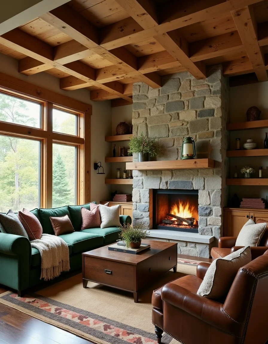 The living room exudes a warm rustic charm, characterized by exposed wooden beams that crisscross the ceiling, offering a rugged yet cozy ambiance. A plush wool area rug in earthy tones anchors the space, with a rich mahogany coffee table positioned at its center, complementing the pine-green upholstered sectional sofa adorned with a mix of knitted throw pillows and a soft fleece blanket draped over one arm. Flanking the sofa are two distressed leather armchairs, forming an inviting conversation nook, each topped with small patchwork quilts. Wooden shelves laden with hand-carved decorations, jars of wildflowers, and a vintage lantern add character beside the limestone-stone fireplace, whose heat radiates against the backdrop of robust stone, enhancing the overall rustic aesthetic.