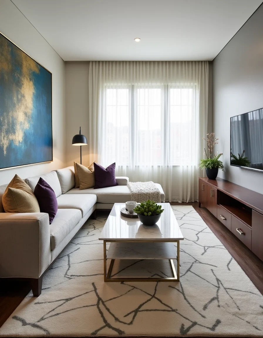 The living room exudes modern elegance, featuring a plush, L-shaped sectional sofa upholstered in a soft, light gray fabric that seats comfortably, facing a sleek rectangular marble coffee table at its center. A large abstract painting in hues of blue and gold adorns the wall above the sofa, complemented by polished chrome accents throughout the space, including a pair of stylish floor lamps with clean lines. To the side, a wall-mounted entertainment unit made of dark, rich wood contrasts beautifully with the light colors, housing a flat-screen TV and stylish decorative items like a vibrant succulent arrangement in a minimalist pot. An area rug in geometric patterns of cream and charcoal anchors the seating area, enveloping it in warmth and sophistication, while large windows dressed with sheer white curtains allow for ample natural light, enhancing the airy atmosphere.